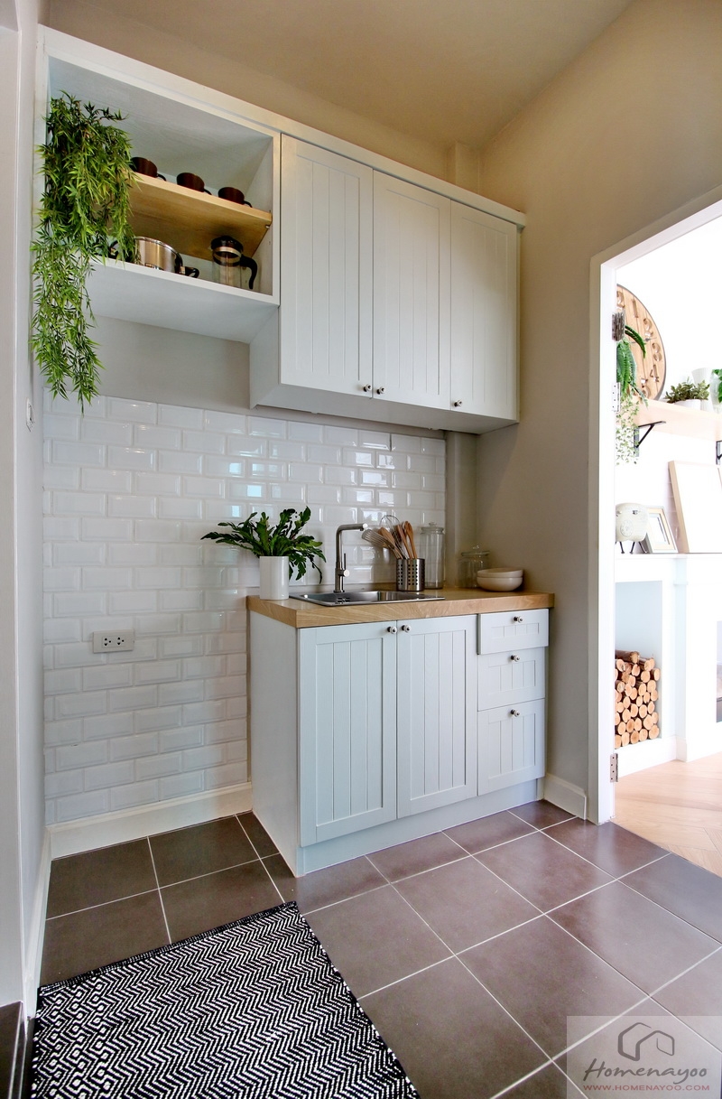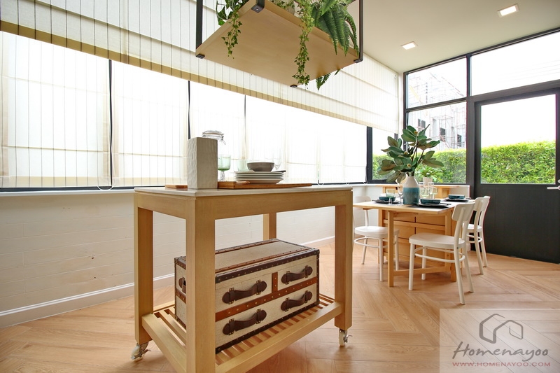 ในส่วนของห้องครัว ทางโครงการให้เป็นครัวปิด มีบานเลื่อนอลูมิเนียมสีดำเป็นตัวแบ่งส่วน ป้องกันกลิ่นรบกวนส่วนอื่นเวลาประกอบอาหาร