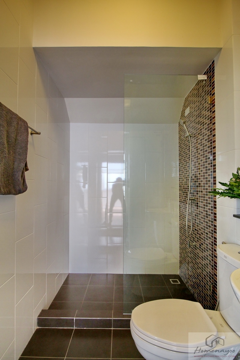 โซนเปียกอาบน้ำ ติดตั้งฉากอาบน้ำใหญ่ประมาณ 40% ของความกว้าง ไม่มีบานสวิง ด้านนอกมีระเบียง