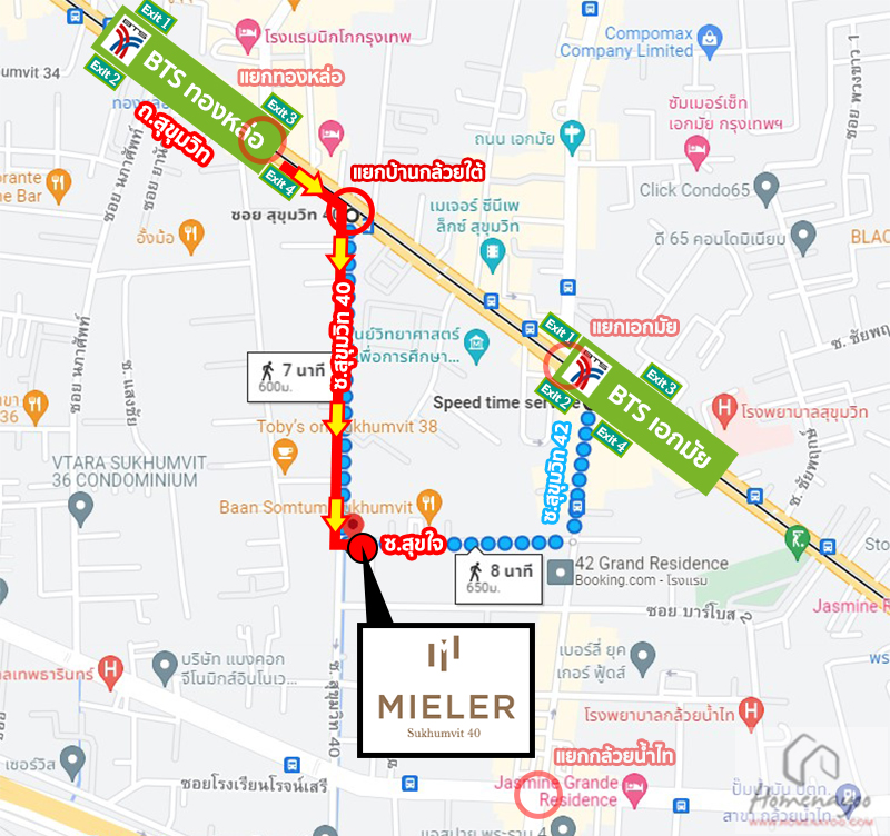 การเดินทางจาก แยกทองหล่อ ⇒ แยกบ้านกล้วยใต้ ⇒ ซอยสุขุมวิท 40 (ซอยบ้านกล้วยใต้) ⇒ ซอยสุขใจ ⇒ Mieler Sukhumvit 40 ใกล้ 2 สถานี BTS เอกมัย และ BTS ทองหล่อ ประมาณ 650 เมตร*
