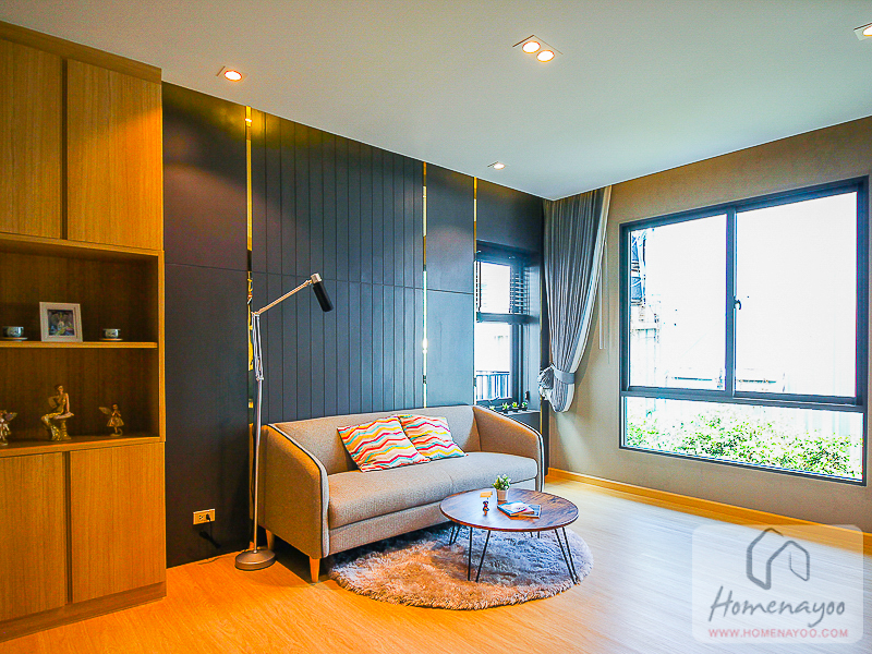 พร้อมช่องแสงขนาดใหญ่ตรงบริเวณส่วนห้องนั่งเล่นถึง 2 จุด คือหน้าต่างบานเลื่อนคู่ด้านหน้าบ้าน และประตูบานเลื่อนคู่ที่เปิดออกไปลานจอดรถ