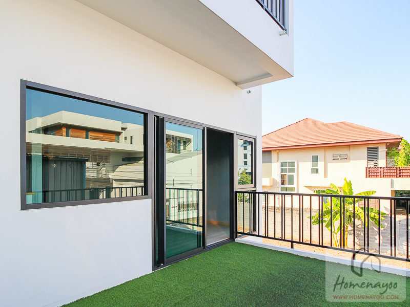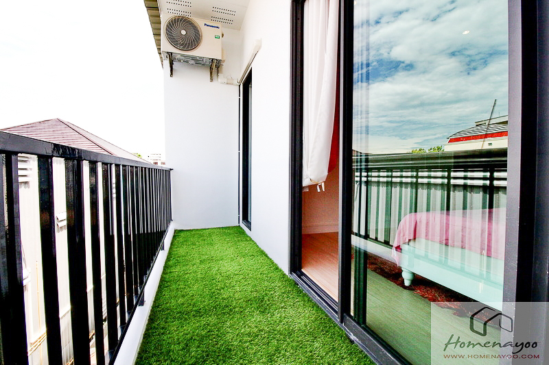 พื้นที่ระเบียงกว้างขวางและปูหญ้าเทียมมาให้เรียบร้อย สามารถใช้เป็นพื้นที่พักผ่อนหรือจัดปาร์ตี้ของคนในบ้านได้ดี