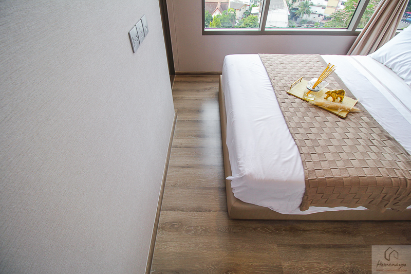 เดินเข้าห้องมาจะเจอส่วนห้องครัวก่อน ได้เป็นครัวปิดมีฉากกั้นบานเลื่อนเปิดปิดให้ ถัดเข้าไปติดกับครัวเป็นห้องน้ำ ด้านในเป็นส่วนของห้องนอนและห้องนั่งเล่นใช้พื้นที่ร่วมกัน มีระเบียงห้องอยู่ด้านในสุด พื้นส่วนครัวเป็นกระเบื้องแกรนิตโต้ ส่วนในห้องนอนจะเป็นไม้ลามิเนตหนา 12 มม. ฝ้าสูง 3 ม. ผนังได้ฉาบเรียบทาสีทั้งห้อง