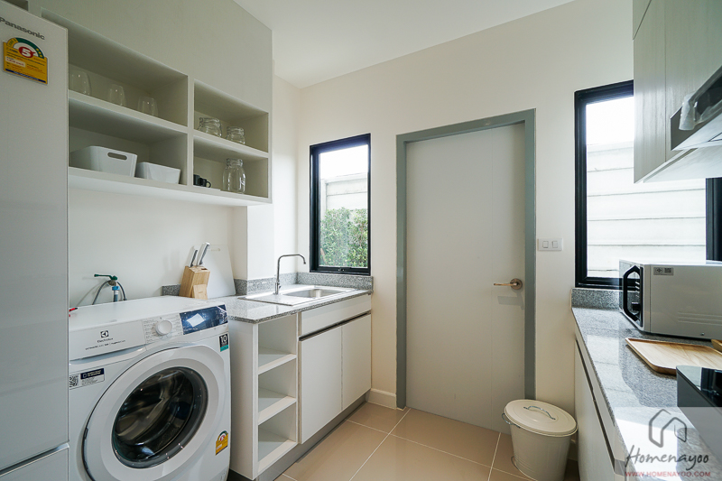 เชื่อมเข้ามาที่ส่วนครัวด้านใน จะมีติดตั้งเคาน์เตอร์ครัวครบชุดมาให้พร้อมใช้งาน ส่วนการระบายอากาศในห้องครัวมีหน้าต่างบานสไลด์บานใหญ่ ติดตั้งไว้ตรงตำแหน่งซิ้งค์ล้างจาน ช่วยรับแสงะรรมชาติจัดการเชื้อแบคทีเรียต่าง ๆ ได้