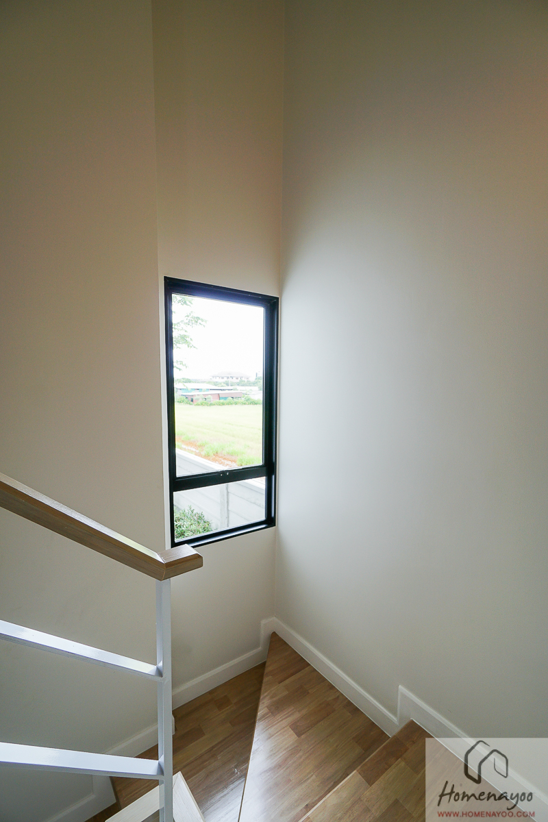 ชานพักบันไดเป็นสี่เหลี่ยมเต็มขั้น พร้อมช่องแสงบานกระทุ้งและบานฟิกซ์ ช่วยรับแสงธรรมชาติเข้าสู่พื้นที่โถงบันได