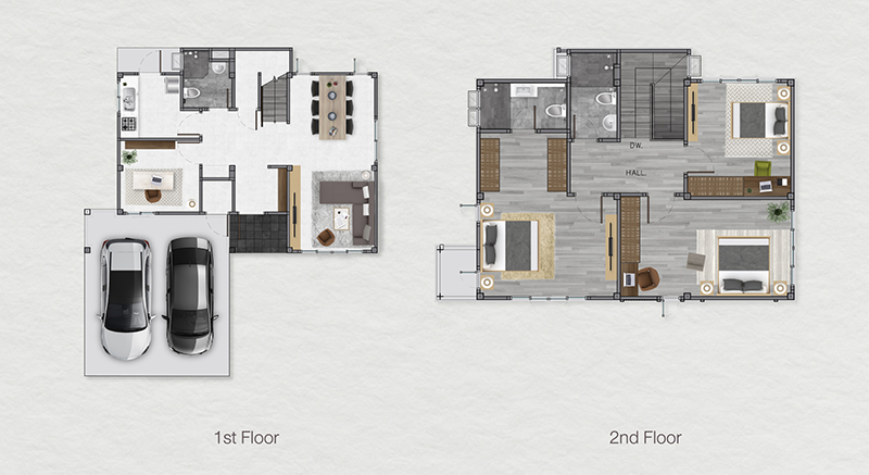 แปลนชั้น 1 ส่วนหน้าบ้านเป็นที่จอดรถ 2 จอด ส่วนการจัดพื้นที่ในตัวบ้านจะใกล้เคียงกับแบบที่แล้ว จะมีส่วนที่แตกต่างคือตำแหน่งของโถงบันไดค่ะ ส่วนการจัดวางโซนในส่วน Common Area และโซน Privacy จะแบ่งแยกออกมาค่อนข้างชัดเจน