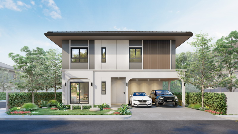 ที่นี่จะพัฒนาเป็นโครงการบ้านเดี่ยว 2 ชั้น สไตล์ Modern Semi Minimal โดยตัวบ้านเลือกใช้ Facade ในสี Earth Tone อย่างสีเทาเข้ม, เทาอ่อน และสีน้ำตาลเลียบแบบลายไม้ ให้ความรู้สึกที่อบอุ่น ผ่อนคลาย กลมกลืนไปกับธรรมชาติโดยรอบ
