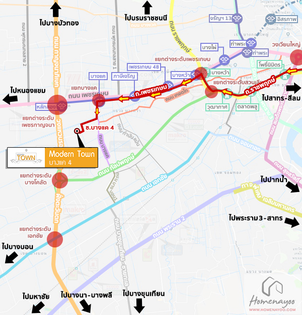 การเดินทางเริ่มจาก ทางแยกต่างระดับเพชรเกษม ถนนเพชรเกษม (BTS บางหว้า เชื่อมกับ MRT บางหว้าและ ท่าเรือสะพานตากสิน-เพชรเกษม) ⇒ MRT เพชรเกษม 48 ⇒ MRT ภาษีเจริญ ⇒ MRT บางแค แยกบางแค ⇒ ถนนบางแค ⇒ ซ.บางแค 4 ขับตรงไปอีก 1 กม. ถึงโครงการ Modern Town ซ.บางแค 4