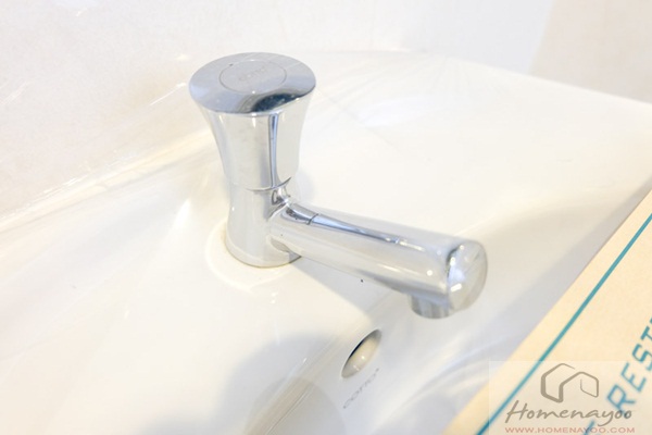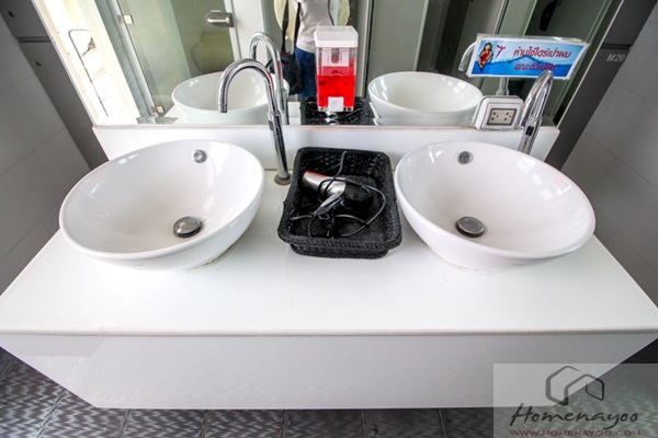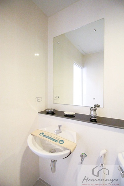 อ่างล้างหน้าเหมือนกับชั้นล่างค่ะ ไม่มีเคาน์เตอร์ด้านล่าง มีติดตั้งก๊อกน้ำซักล้างให้ใต้อ่าง กระจกบานใหญ่ยึดผนัง