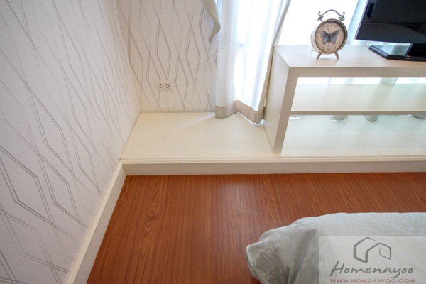 โครงการ Build พื้นลอยบริเวณปลายเตียงไว้ให้สำหรับวางโต๊ะวางทีวีแบบนี้ค่ะ นำไปใช้เป็นไอเดียได้นะคะ หากตกแต่งตามแนะนำให้ใช้เป็นผ้าม่านทึบแสงนะคะ เวลาดูทีวีแสงจากภายนอกจะได้ไม่ย้อนแยงตา