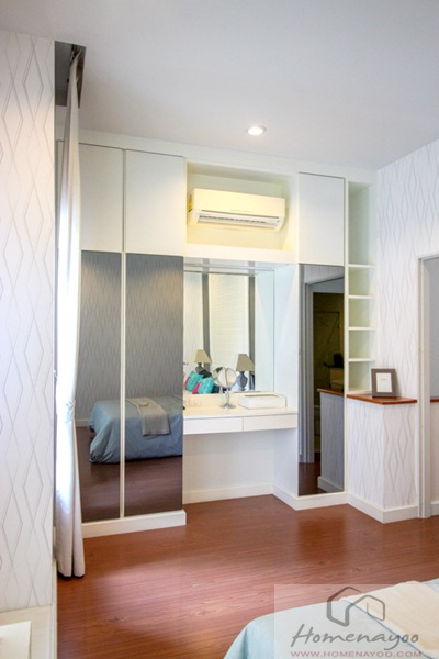 เนื่องจากห้องนี้ขนาดเล็ก โครงการได้ทำตู้เสื้อผ้าและโต๊ะเครื่องแป้งแบบเข้ามุมมาให้ชมเป็นไอเดีย ซึ่งการเข้ามุมนี้ช่วยให้ประหยัดพื้นที่ลงไปได้เยอะเลยค่ะ