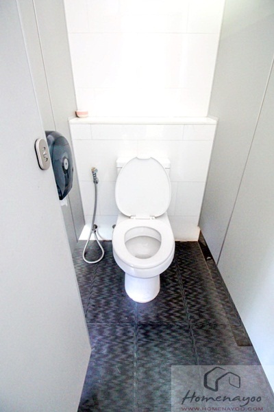 พื้นที่ห้องน้ำ วัสดุพื้นกระเบื้องเซรามิกขนาด 30×30 ซม. ส่วนผนังปูสีขาวเดียวกับพื้น ปูจรดเพดาน