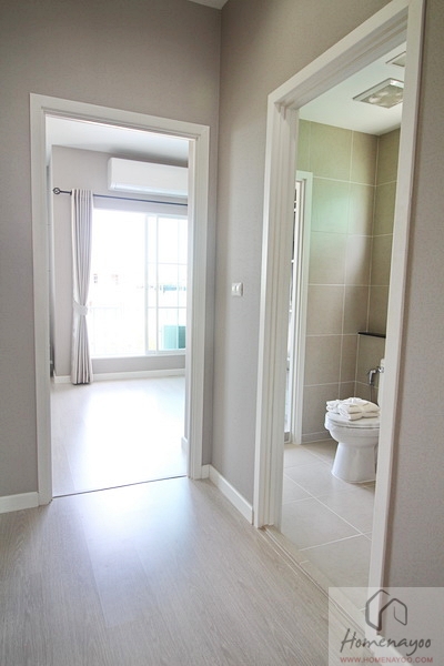 พื้นห้องจะปูด้วยกระเบื้องเซรามิคขนาด 30×30 ซม. ธรณีประตูจะยกสูงเล็กน้อย จะเห็นว่ามีประตู 2 บาน คือจากตรงโถงทางเดิน จากประตูในห้อง Master Bedroom