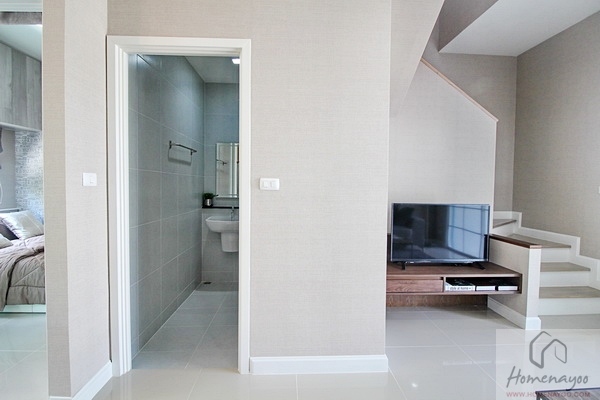 ตรงบันไดจะมีชั้นลอย เป็นบันไดขึ้นไป ตรงนั้นสามารถทำเป็นห้องพระ, มุมทำงาน, มุมอ่านหนังสือได้ค่ะ