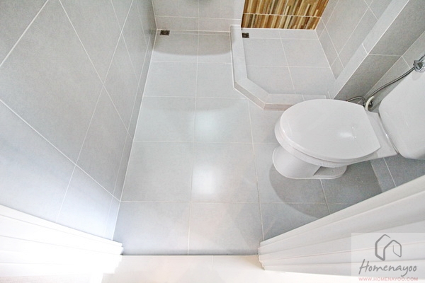 พื้นจะลดระดับลงไปเล็กน้อย ปูด้วยกระเบื้องขนาด 30×30 ซม.