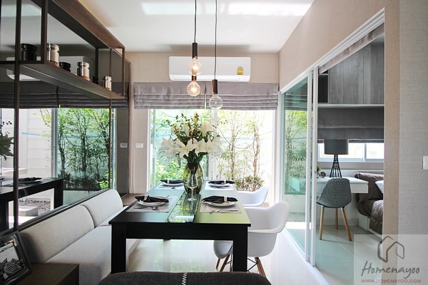 ถัดจากส่วนนั่งเล่นนั้นเป็นโต๊ะทานอาหาร ด้านขวามือจะเป็นห้องน้ำและห้องอเนกประสงค์ ประตูกระจกที่เห็นคือประตูทางไปหลังบ้าน ด้านข้างก็จะเป็นประตูกระจกบานใหญ่ สำหรับแปลงมุมก็จะมีพื้นที่สวนด้านข้างให้ สามารถเปิดออกไปยังสวนข้างบ้านได้