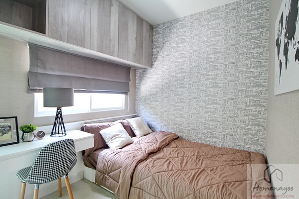 เตียงสามารถวางขนาด 3.5 ฟุตได้ ด้านข้างจะเหลือพื้นที่ให้วางโต๊ะหัวเตียงได้ และถ้าวางเตียงชิดผนังด้านใดด้านหนึ่ง อีกด้านก็เพียงพอจะให้วางโต๊ะทำงาน