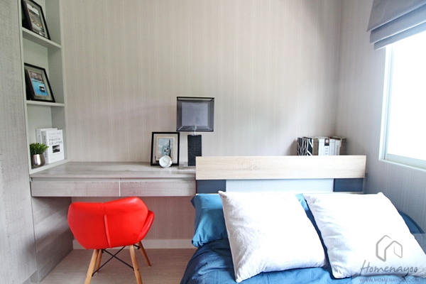 ข้างหัวเตียงสามารถวางโต๊ะทำงานและตู้เสื้อผ้าใบเล็กได้ ด้านข้างที่ติดกับตู้เสื้อผ้า ทำเป็นชั้นวางของได้อีกค่ะ