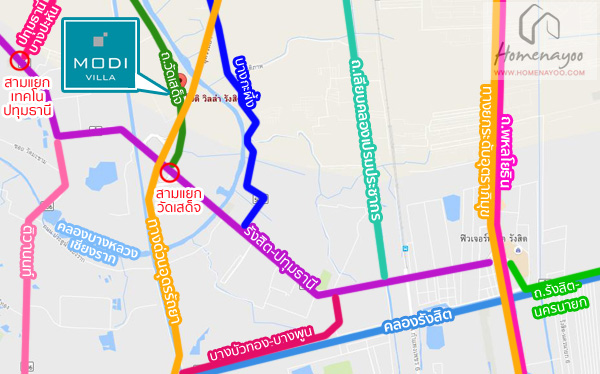 ทำเลที่ตั้งโครงการ – โครงการ Modi Villa รังสิต ตั้งอยู่บนถนนถนนทางหลวงชนบท หรือที่รู้จักกันว่าถนนวัดเสด็จ เป็นถนนที่แยกตัวออกมาจากถนนรังสิต – ปทุมธานี ที่ตั้งโครงการอยู่ในพื้นที่พักอาศัย ไม่ไกลจากทางขึ้น-ลง ทางด่วนอดรรัถยา สามารถเดินทางไปได้หลายเส้นทาง เข้า-ออกตัวเมืองได้สะดวก และมีความอุดมสมบูรณ์ เพราะไม่ไกลจากตลาดสด ห้างสรรพสินค้า สถานที่ราชการ และสถานศึกษา
