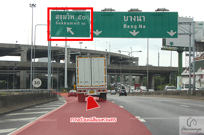 เริ่มจากทางด่วนเฉลิมมหานครมุ่งหน้ามาทางบางนา และลงทางด่วนที่ป้ายสุขุมวิท 50