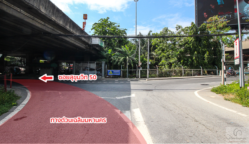 ลงทางด่วนมาจะเจอซอยสุขุมวิท 50 ให้เลี้ยวซ้าย ถ้าเลี้ยวขวาจะไปออกถนนสุขุมวิท