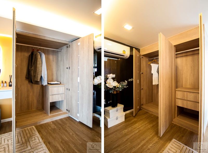 ฝั่งด้านในจะเป็นส่วน Walk in closet ได้ชุดตู้เสื้อผ้า 2 ฝั่งตามนี้เลย ชั้นบนจะได้แอร์ติดผนัง 1 ตัว