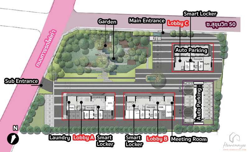 จากทางเข้า-ออกโครงการฝั่งซอยสุขุมวิท 50 ผมจะพาเดินไปออกถนนสุขุมวิท ซึ่งจะเป็นที่ตั้งของ BTS อ่อนนุช ระยะทางจากโครงการประมาณ 1.3 กม. ทางโครงการมี Shuttle Van บริการรับ-ส่งที่ Lotus’s สุขุมวิท 50