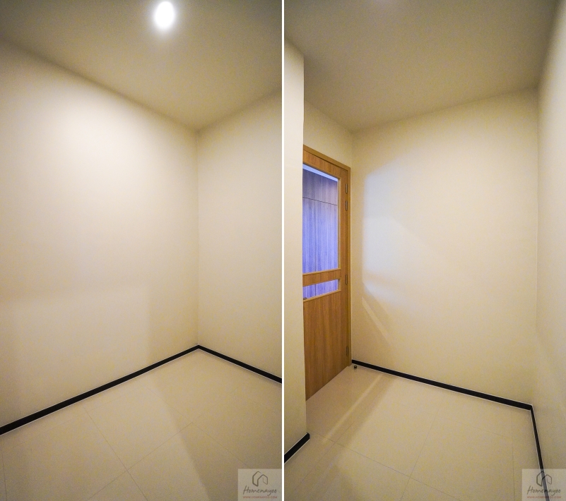 ถัดเข้าไปอีกซ้ายมือจะเป็นห้องเก็บของ ขวามือเป็นประตูเชื่อมออกที่จอดรถ ตรงหน้าจะเป็นประตูห้องครัว