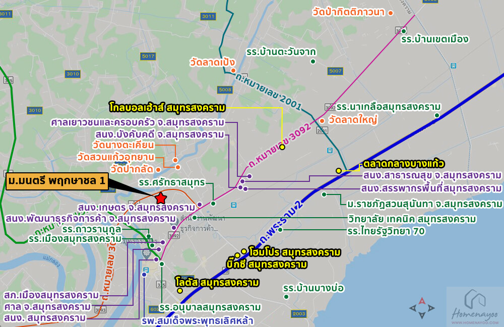 มนตรี พฤกษาชล 1 จาก บริษัท พงศ์ธนา เรียลเอสเตท จำกัด ตั้งอยู่บน ถนนทางหลวงแผ่นดินหมายเลข 3093 ต.บ้านปรก อ.เมืองสมุทรสงคราม จ.สมุทรสงคราม