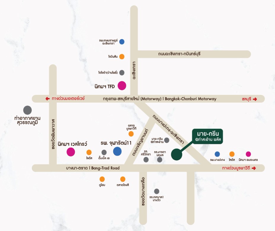 My Green @ท่าสะอ้าน พลัส บ้านโครงการใหม่ จาก บริษัท มายกรีนทาวน์ จำกัด โครงการตั้งอยู่ตำบลท่าสะอ้าน อ.บางปะกง จ.ฉะเชิงเทรา เดินทางสะดวก ติดถนนสายหลัก (ถนนบางปะกง-ฉะเชิงเทรา) ใกล้ทางขึ้นมอเตอร์เวย์ กรุงเทพ-ชลบุรี สายใหม่ หรือจะเข้าตัวเมืองฉะเชิงเทราก็ง่าย จะวิ่งไปบางนา-ตราดก็สะดวกสบายทุกเส้นทาง