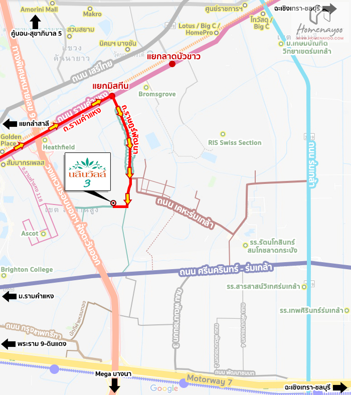 การเดินทางเราเริ่มจาก ถ.รามคำแหง ⇒ The Paseo Town รามคำแหง ⇒ แยกมิสทีน ⇒ ถ.ราษฎร์พัฒนา ขับตรงไปประมาณ 3.1 กม.ถึงโครงการ นลินวิลล์ 3 รามคำแหง