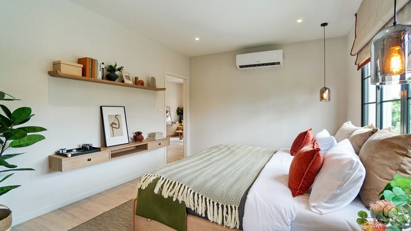 ขณะที่ข้างเตียงทางฝั่งขวาจัดเป็นมุมโต๊ะทำงาน, มุมโต๊ะเครื่องแป้ง หรือวางตู้เสื้อผ้าเหมือนบ้านตัวอย่างก็ตอบโจทย์