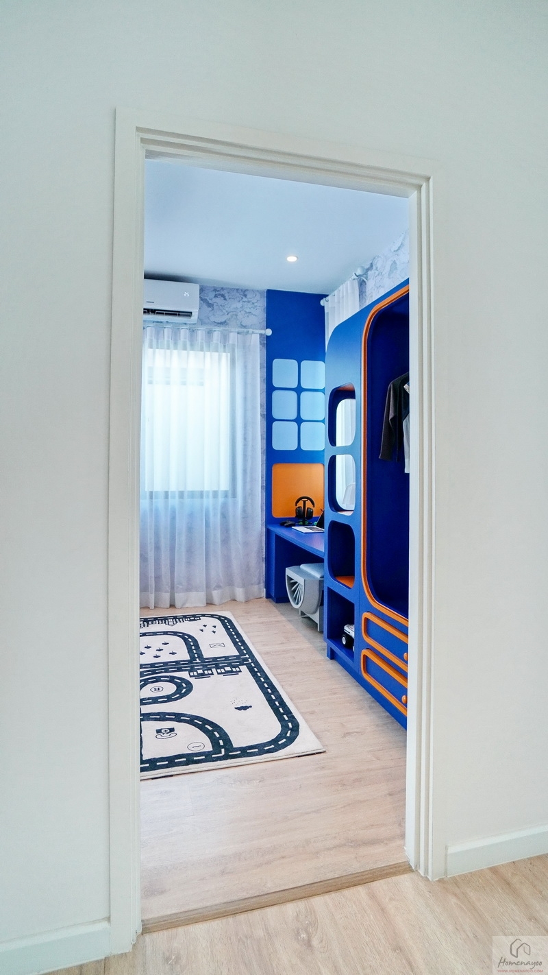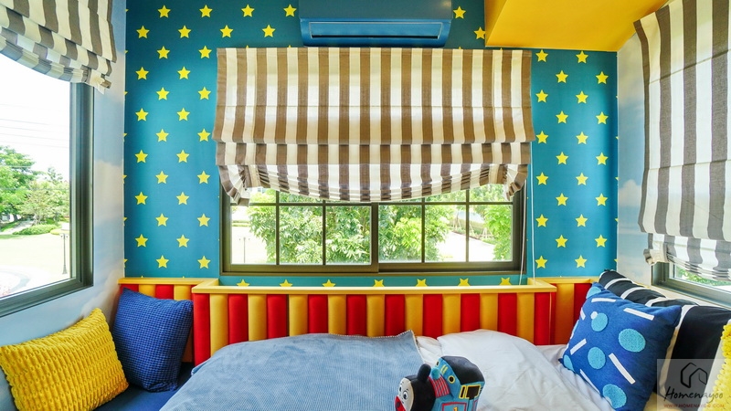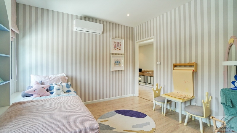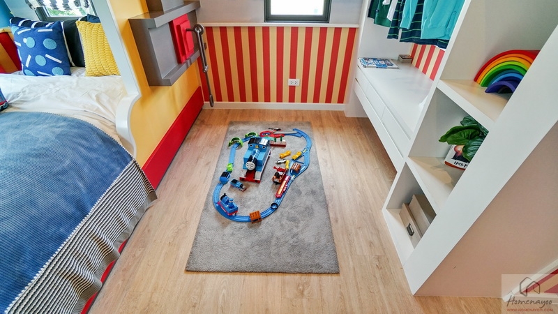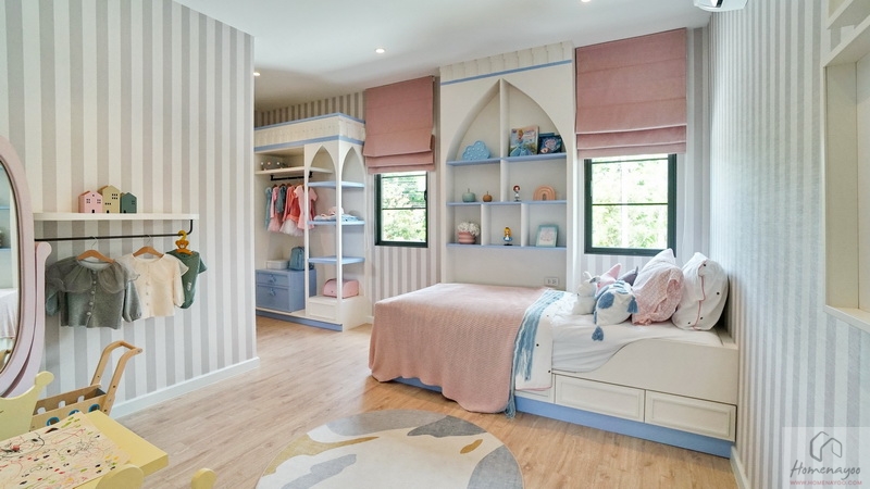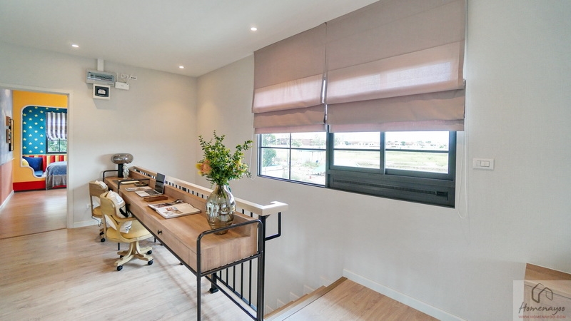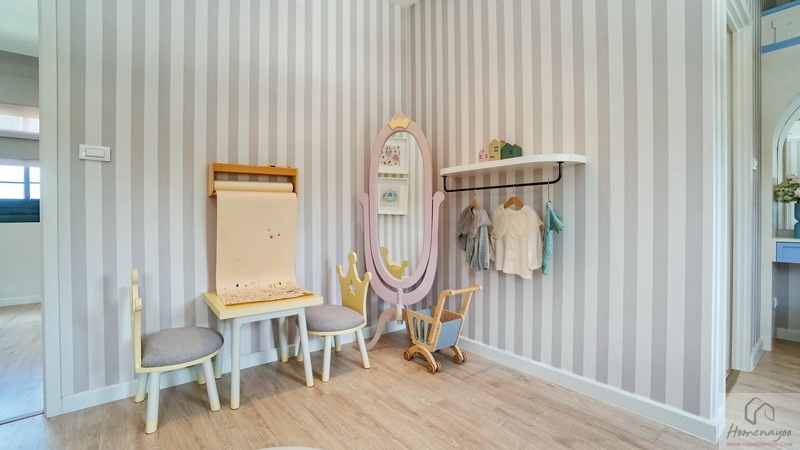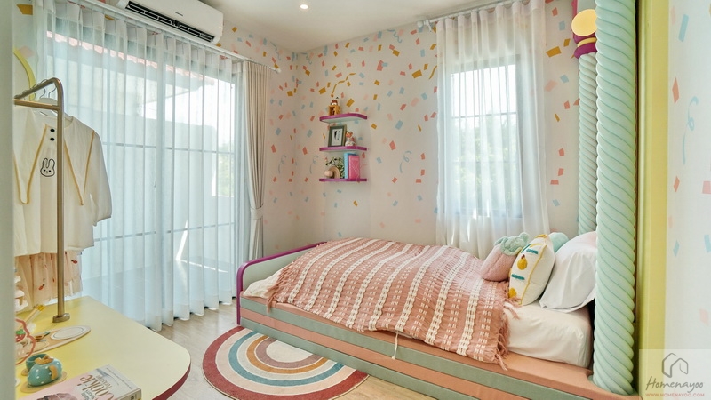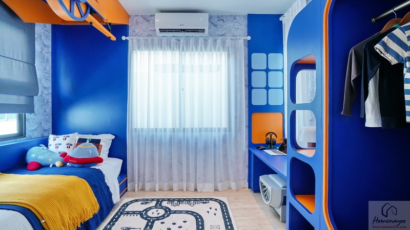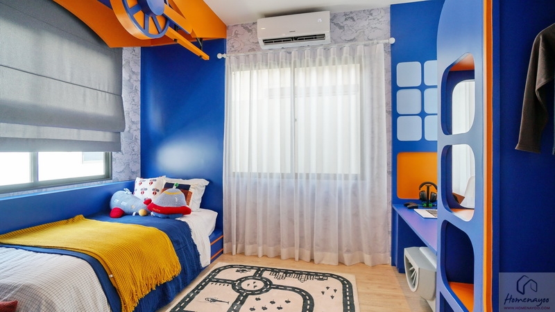 ฝั่งปลายเตียงเยื้องกันทางซ้ายเหมาะจัดเป็นมุมโต๊ะทำงาน หรือโต๊ะทำการบ้านสำหรับเด็ก ๆ ตกแต่งเพิ่มเติมด้วยตู้เก็บของก็ได้ โดยเป็นพื้นที่แบบเข้ามุมสามารถเปลี่ยนเฟอร์นิเจอร์หลักได้ตามชอบ