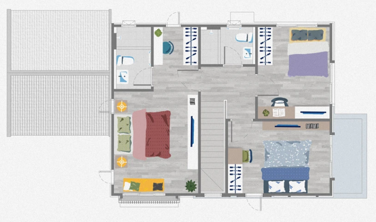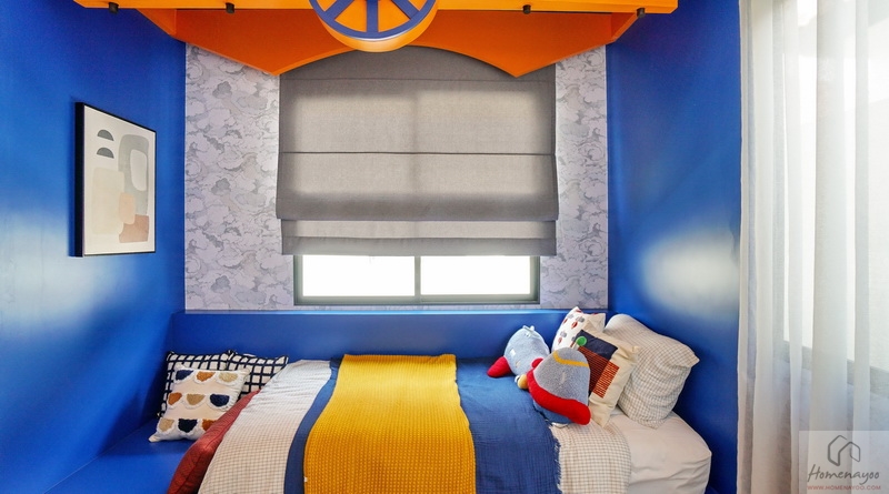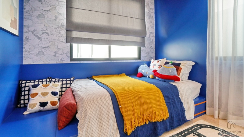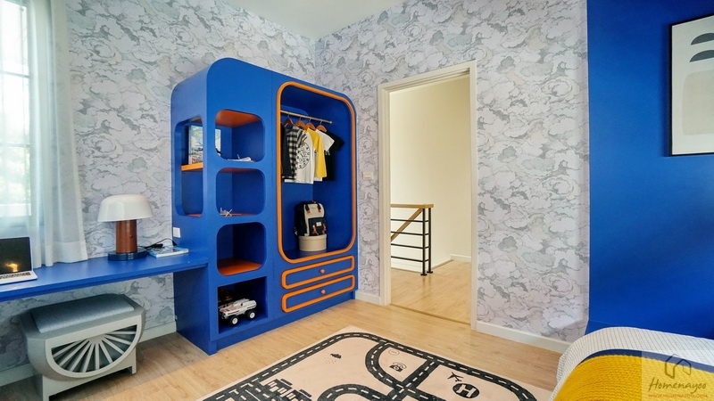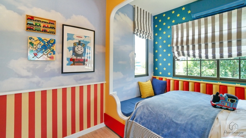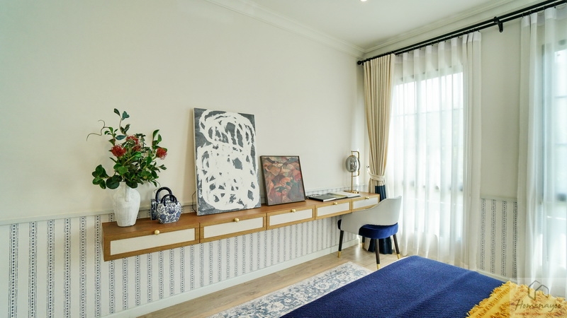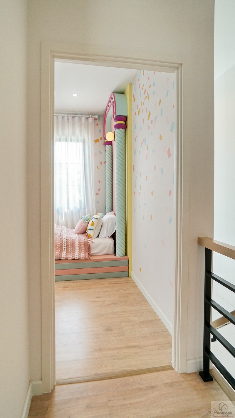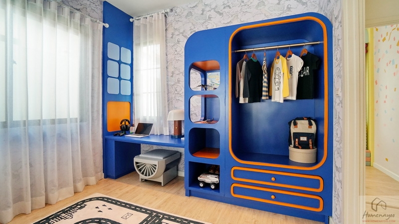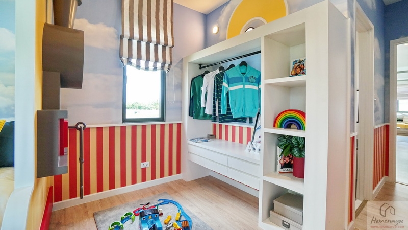 ฝั่งปลายเตียงเยื้องกันทางซ้ายเหมาะจัดเป็นมุมโต๊ะทำงาน หรือโต๊ะทำการบ้านสำหรับเด็ก ๆ ตกแต่งเพิ่มเติมด้วยตู้เก็บของก็ได้ โดยเป็นพื้นที่แบบเข้ามุมสามารถเปลี่ยนเฟอร์นิเจอร์หลักได้ตามชอบ