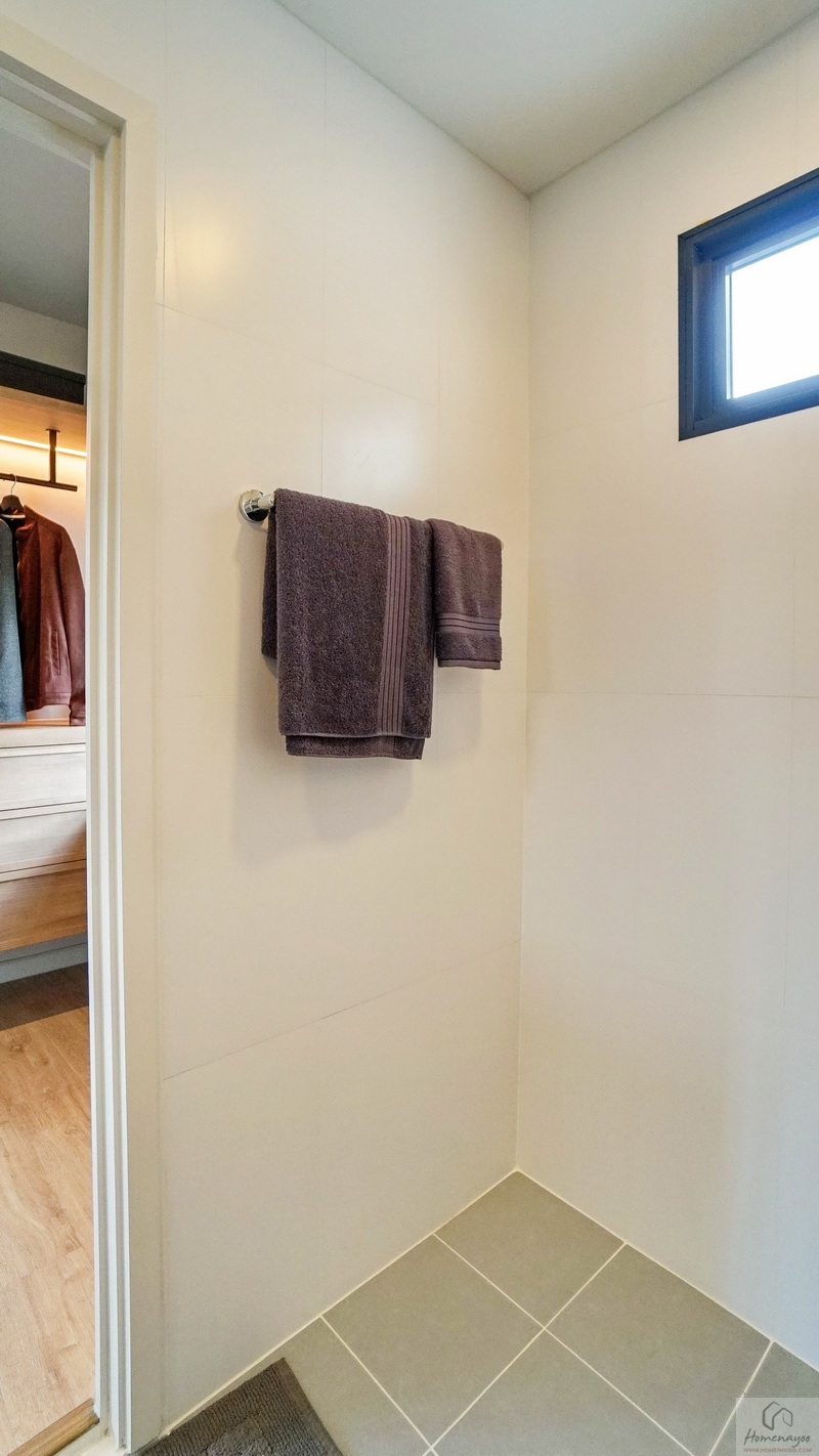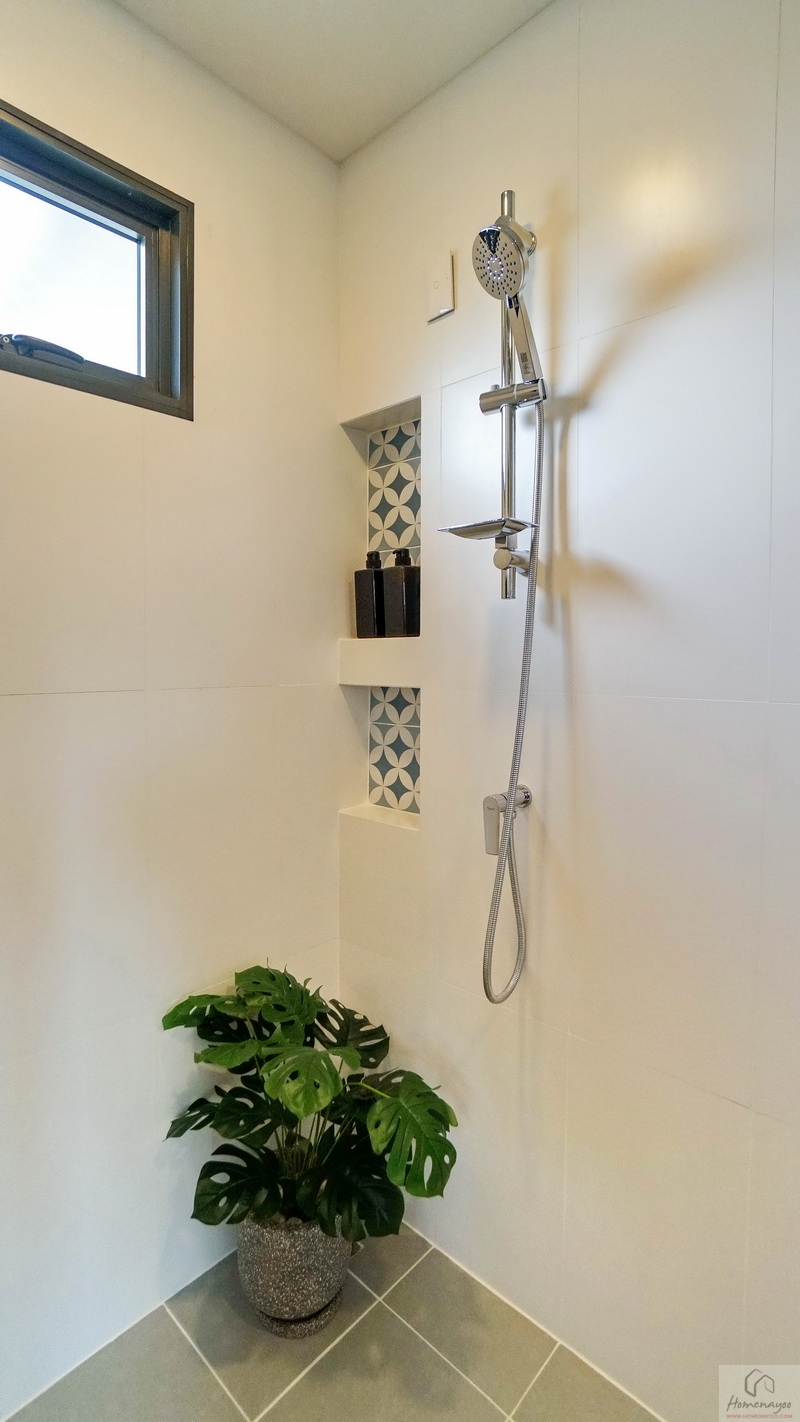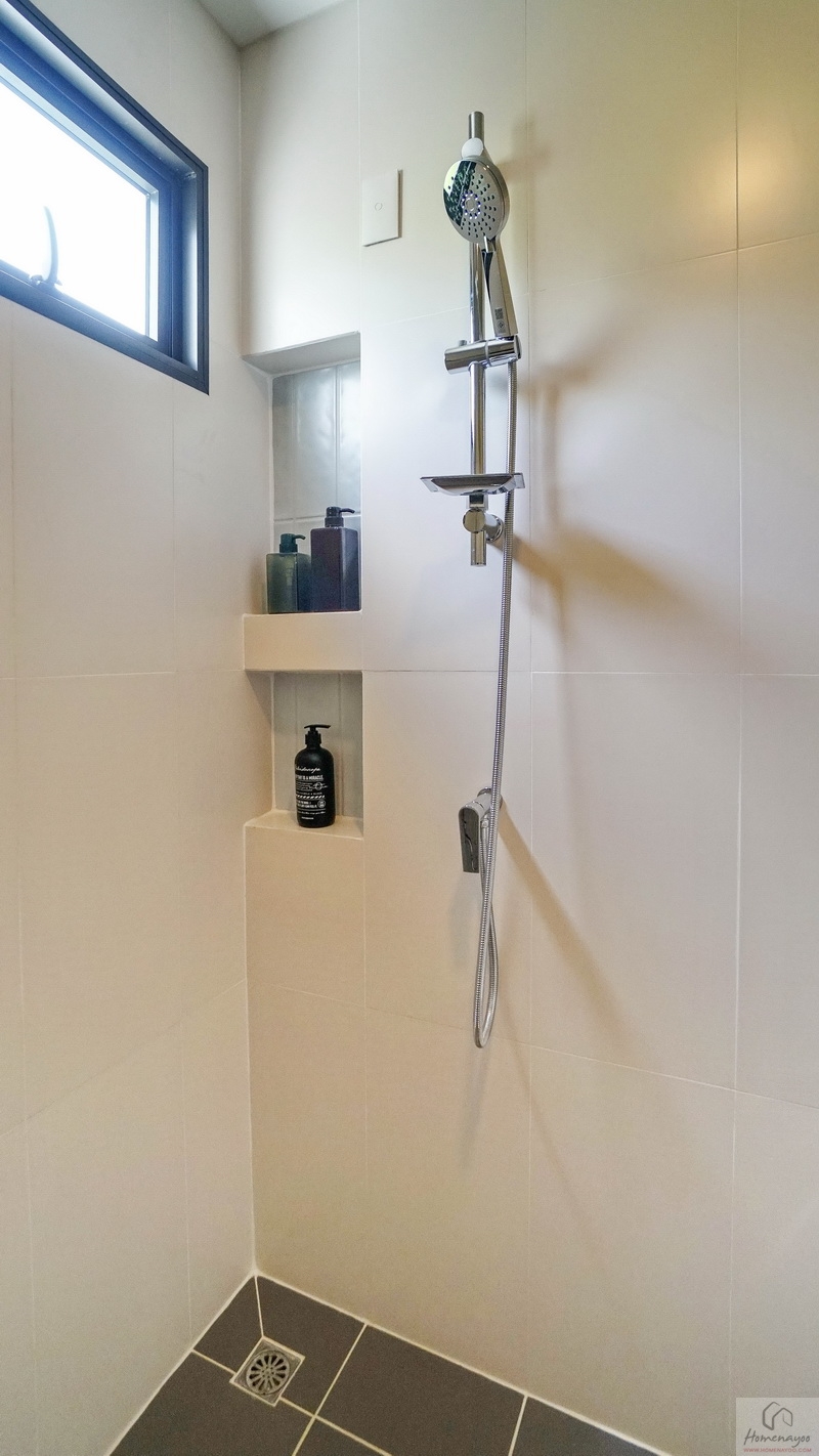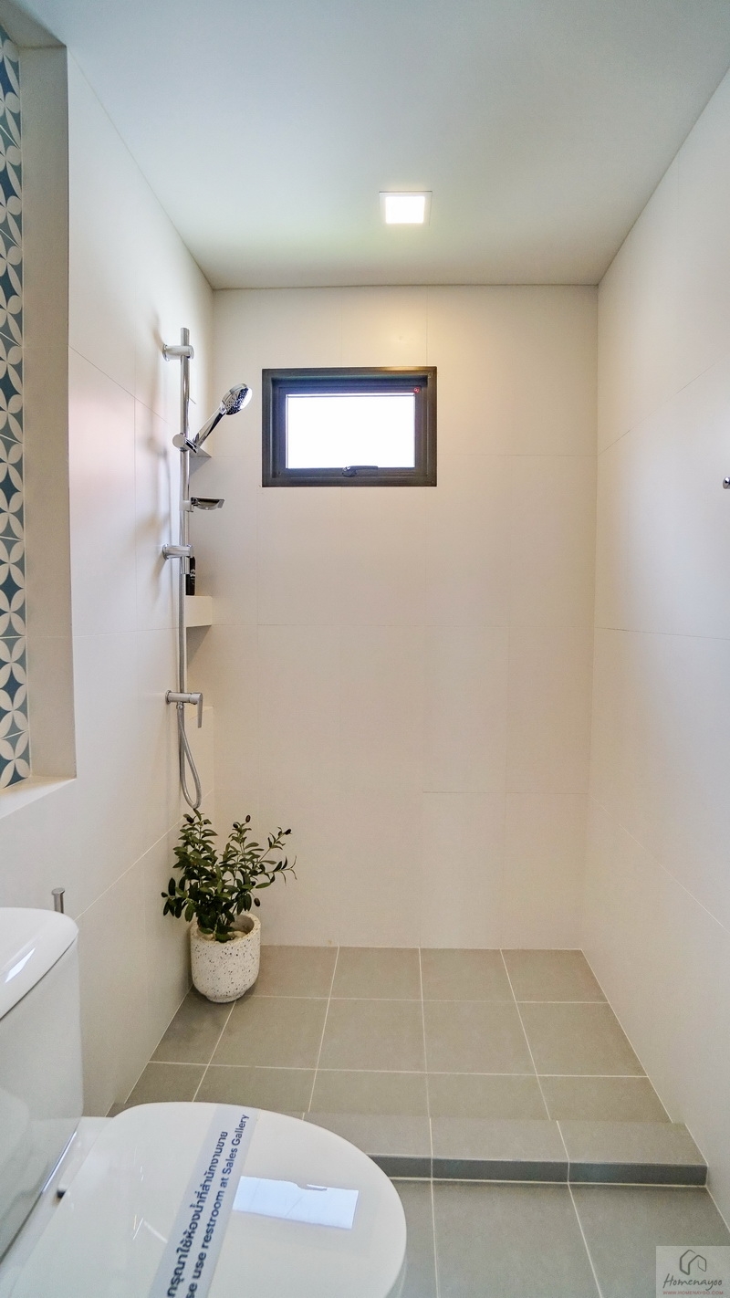 ถัดมาเป็นมุมอาบน้ำใช้ฝักบัว Hand Shower มีราวปรับระดับสูง-ต่ำและที่วางสบู่ในตัว บนผนังเดินงานระบบไฟฟ้าติด Junction Box ให้เรียบร้อย พร้อมเจาะผนังทำเป็นชั้นวางของใช้ให้ 2 Step มีหน้าต่างกระจกฝ้าบานกระทุ้งให้ 1 บาน ช่วยระบายอากาศและความชื้นได้ดี