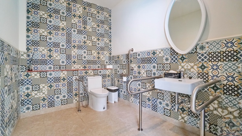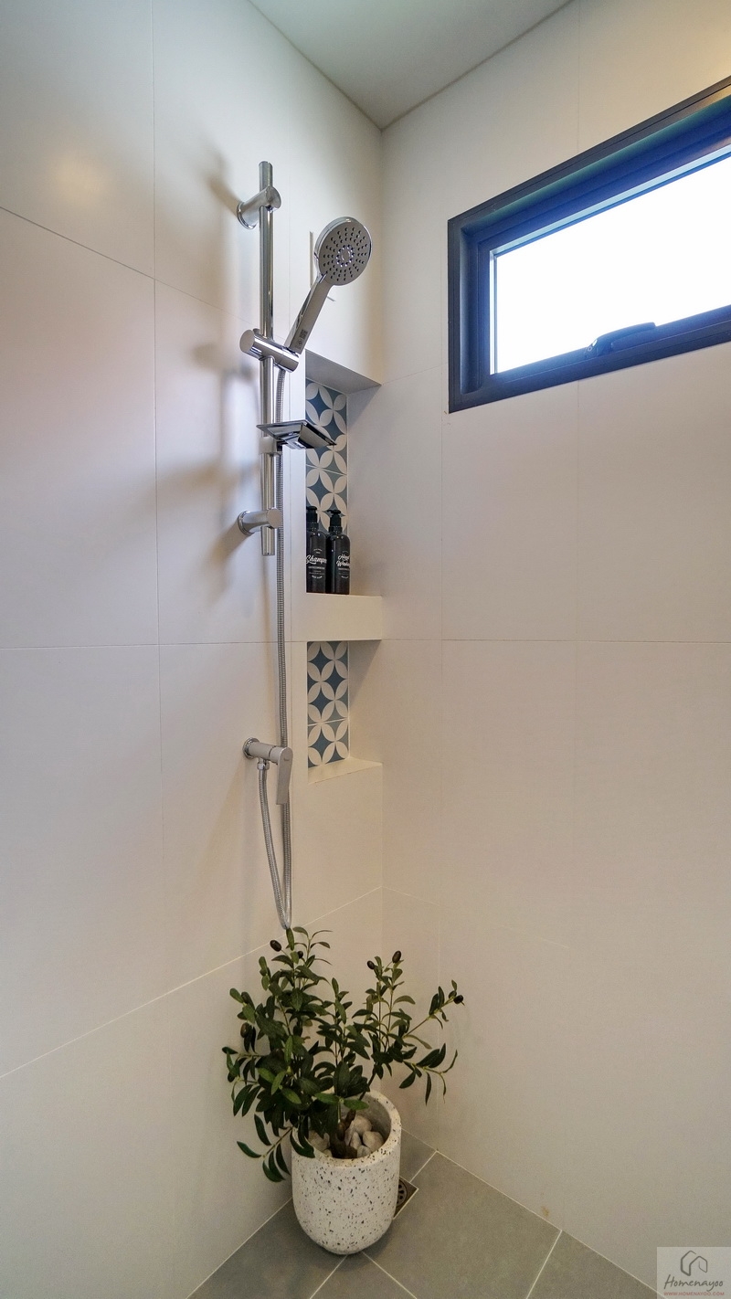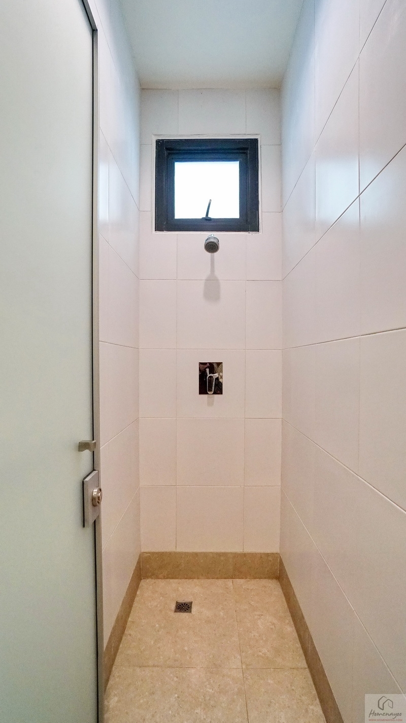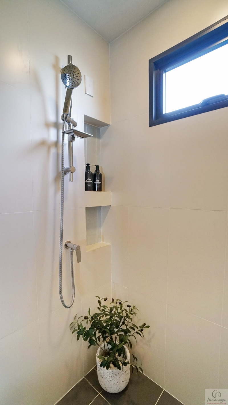 ถัดมาเป็นมุมอาบน้ำใช้ฝักบัว Hand Shower มีราวปรับระดับสูง-ต่ำและที่วางสบู่ในตัว บนผนังเดินงานระบบไฟฟ้าติด Junction Box ให้เรียบร้อย พร้อมเจาะผนังทำเป็นชั้นวางของใช้ให้ 2 Step มีหน้าต่างกระจกฝ้าบานกระทุ้งให้ 1 บาน ช่วยระบายอากาศและความชื้นได้ดี