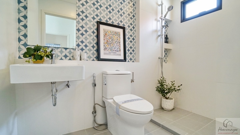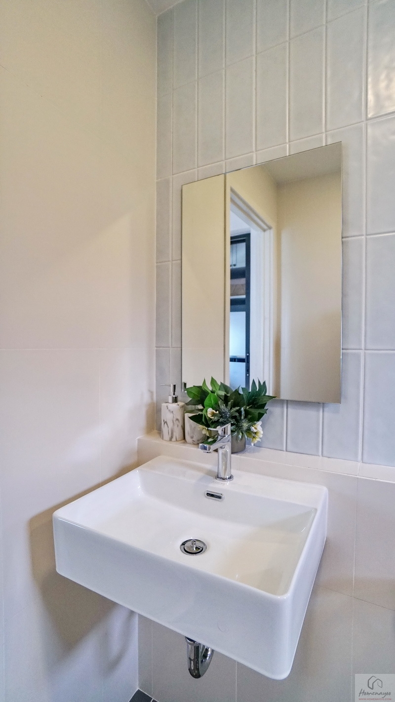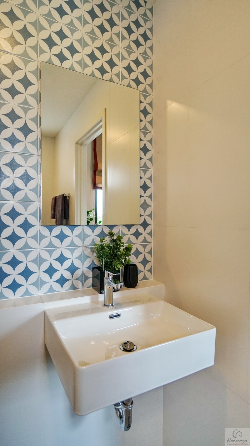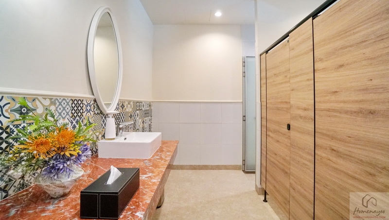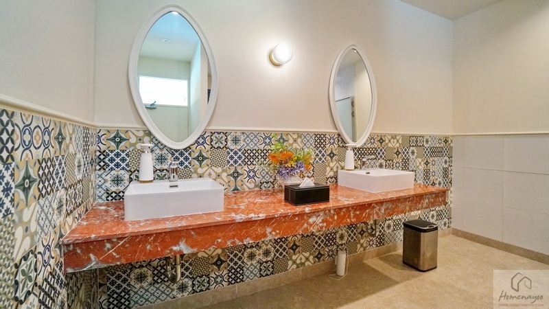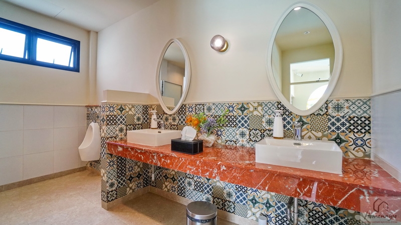 มุมอ่างล้างหน้าใช้ทรงเหลี่ยมแบบแขวนผนังขนาดมาตรฐาน ติดกระจกเงาบานใหญ่ให้ 1 บาน ด้านหลังก่อ Low Wall แนวยาวเต็มพื้นที่ ฝั่งนี้ตกแต่งด้วยกระเบื้องเซรามิกแบบมีลวดลายสวยงาม