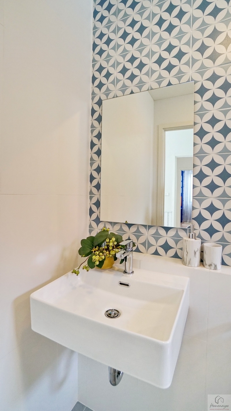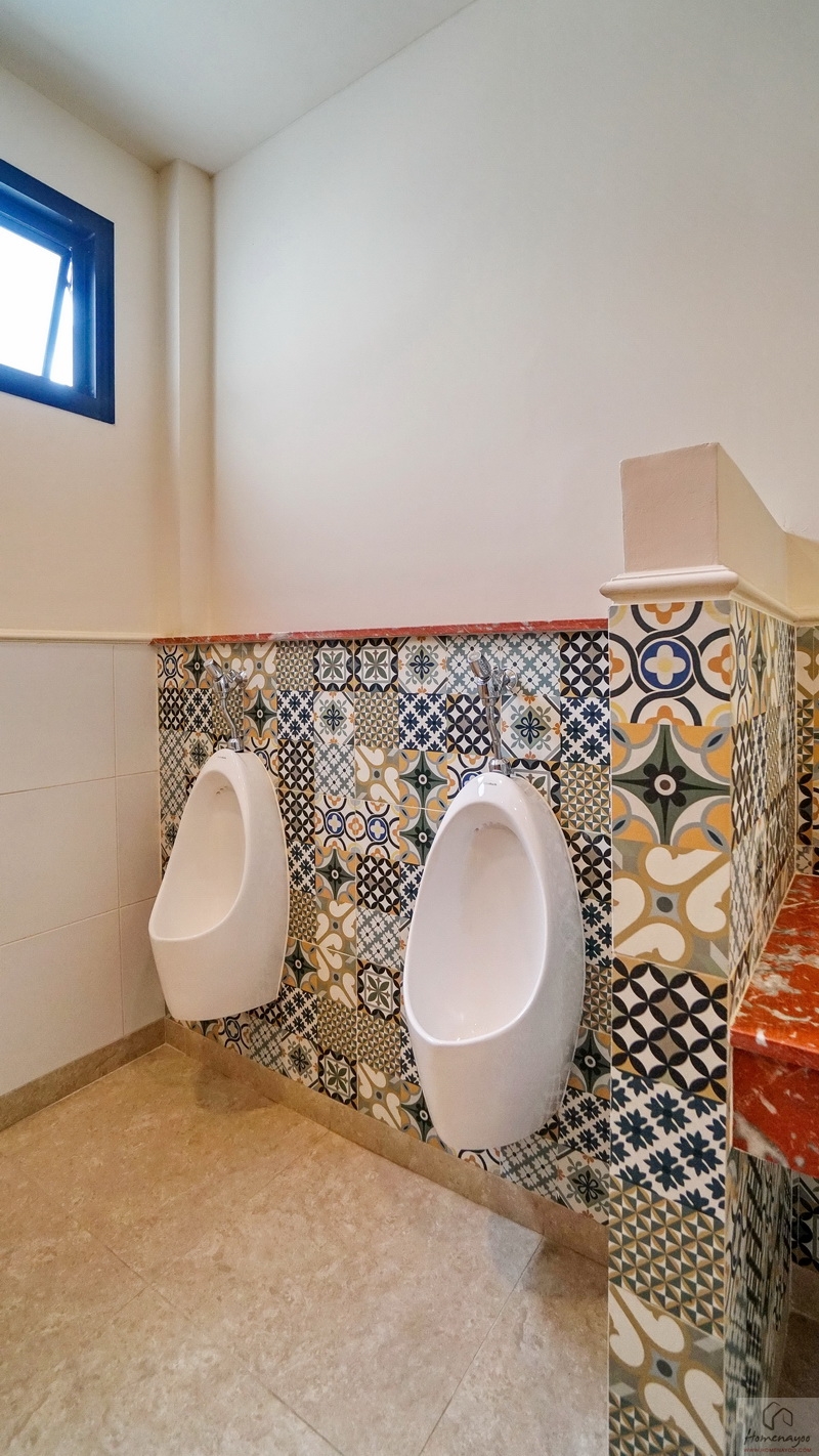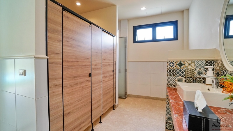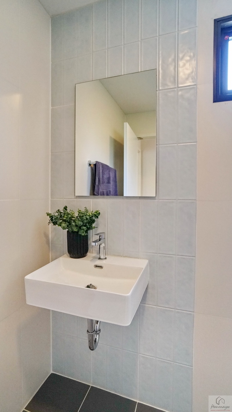 มุมอ่างล้างหน้าใช้ทรงเหลี่ยมแบบแขวนผนังขนาดมาตรฐาน ติดกระจกเงาบานใหญ่ให้ 1 บาน ด้านหลังก่อ Low Wall แนวยาวเต็มพื้นที่ ฝั่งนี้ตกแต่งด้วยกระเบื้องเซรามิกแบบมีลวดลายสวยงาม
