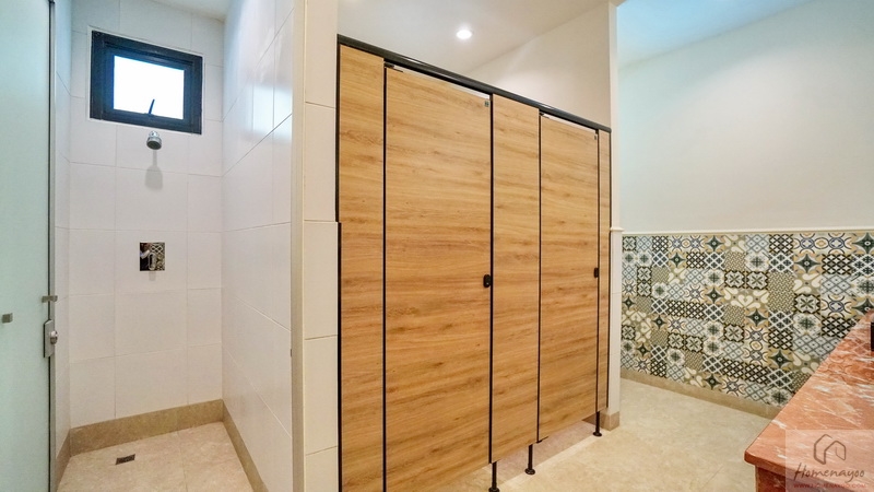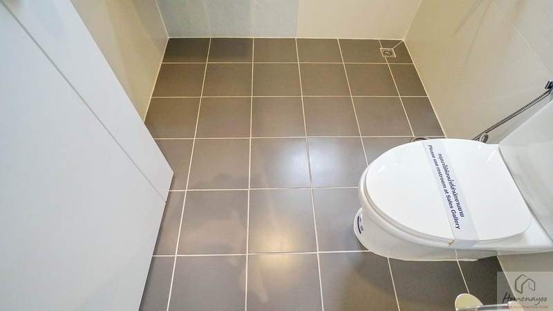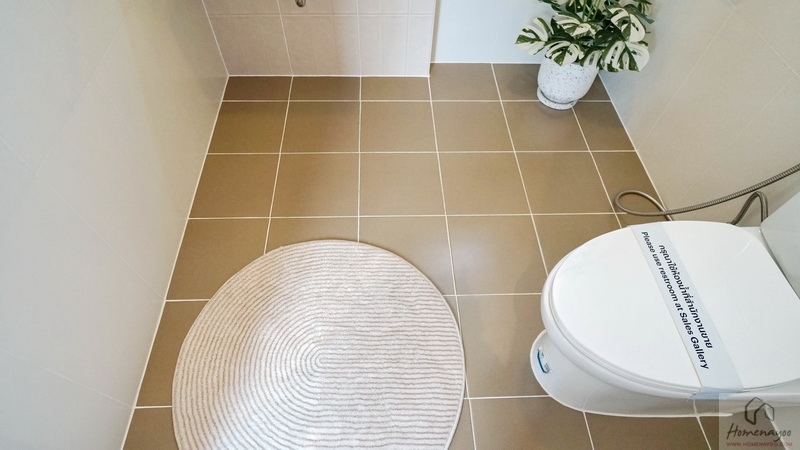 ใกล้กันคือมุมอาบน้ำใช้ฝักบัว Hand Shower มีราวปรับระดับสูง-ต่ำและชั้นวางสบู่ในตัว บนผนังจัดเตรียมสาย Power Supply สำหรับเครื่องทำน้ำอุ่นให้เรียบร้อย