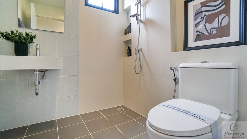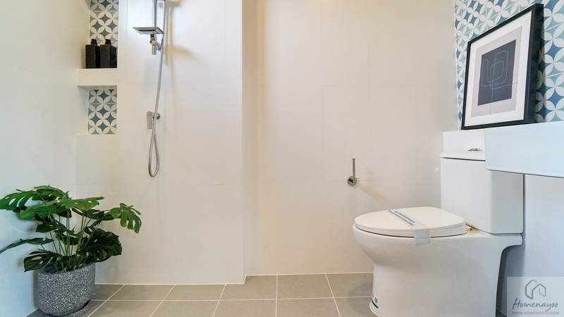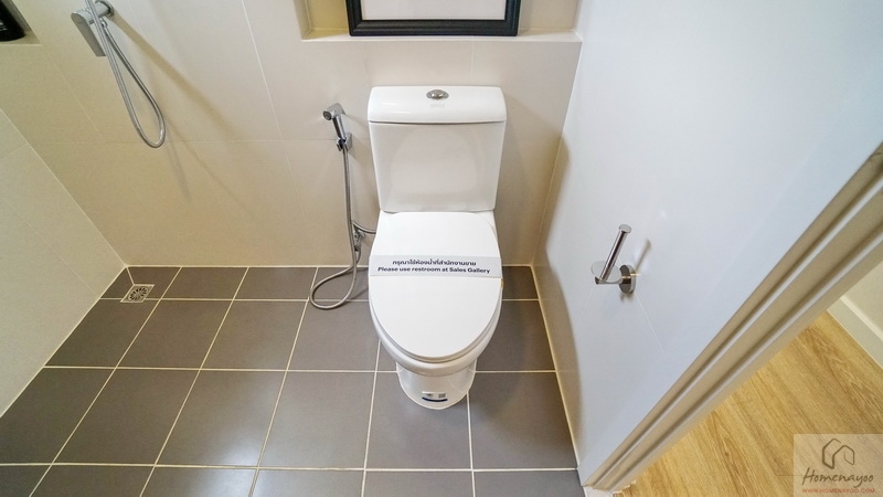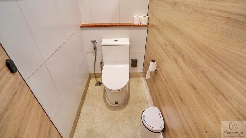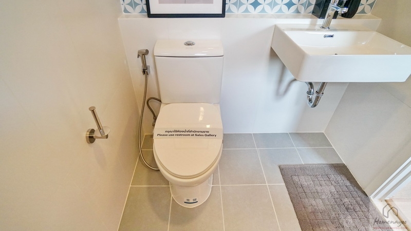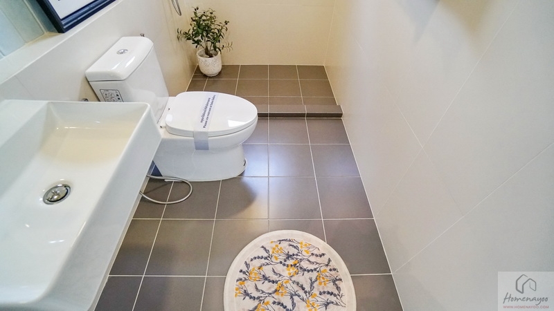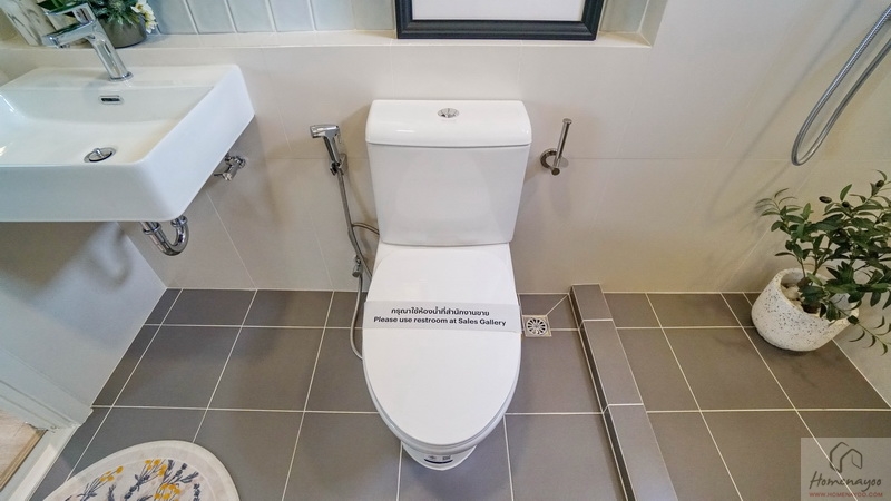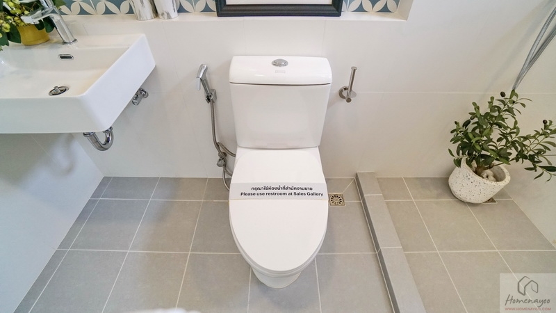 ถัดมาเป็นมุมโถสุขภัณฑ์แบบ 2 Piece ระบบ Dual Flush ด้านข้างติดตั้งสายฉีดชำระ และที่แขวนกระดาษทิชชูมาให้ ระยะการนั่งใช้งานสะดวกสบาย ด้านหลังก่อ Low Wall วางของใช้หรือน้ำหอมปรับอากาศได้อีก