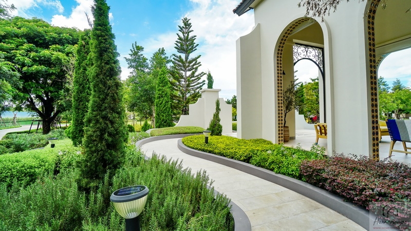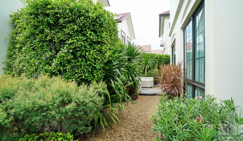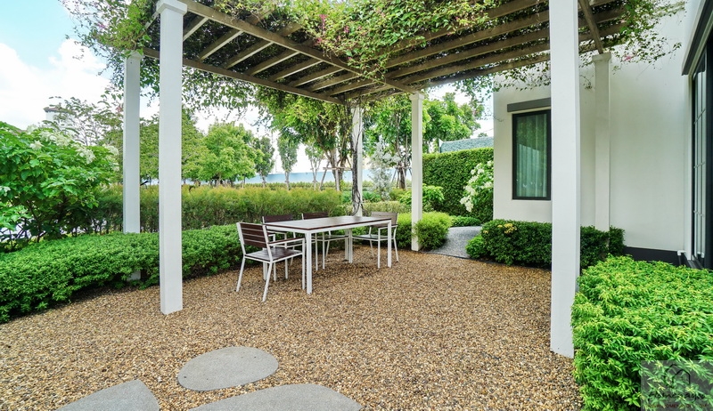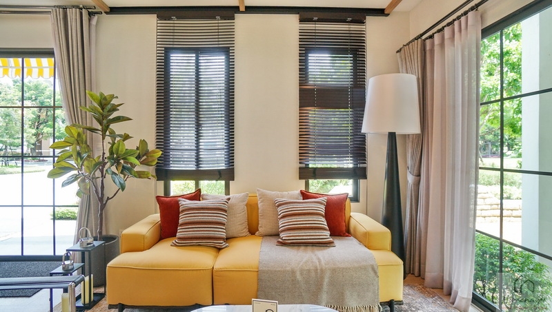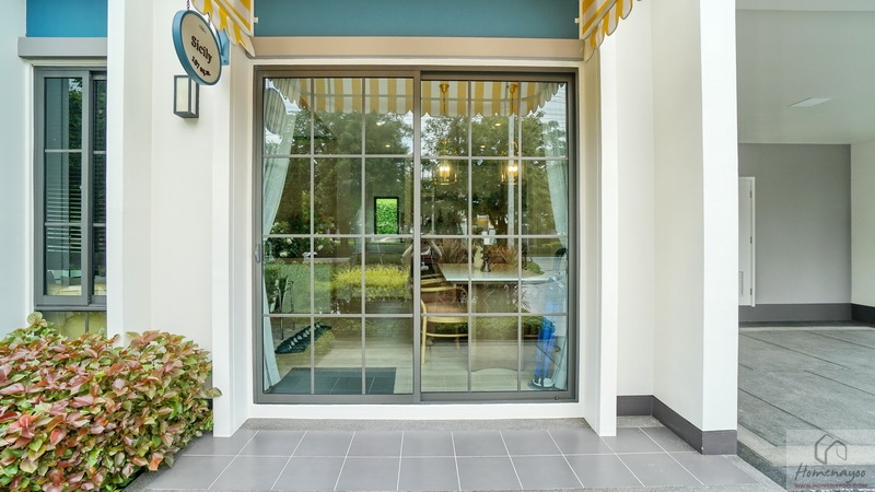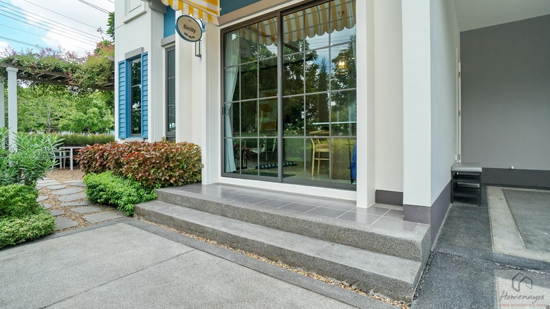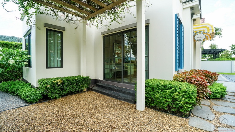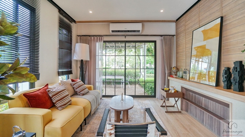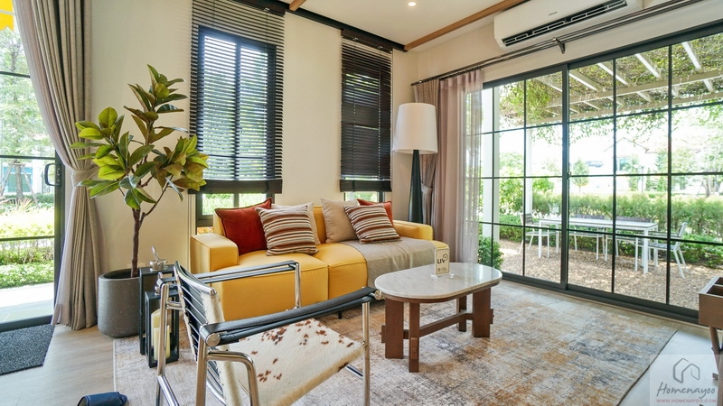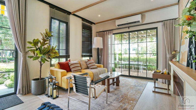 มีประตูกระจกบานเลื่อนขนาดใหญ่เปิดเชื่อมเข้าไปยัง Living Area บรรยากาศรอบ ๆ บ้านตัวอย่างตกแต่งด้วยพุ่มไม้ดอกไม้, ต้นไม้ใหญ่ให้ร่มเงา, ไม้เลื้อย และสวนหินธรรมชาติ