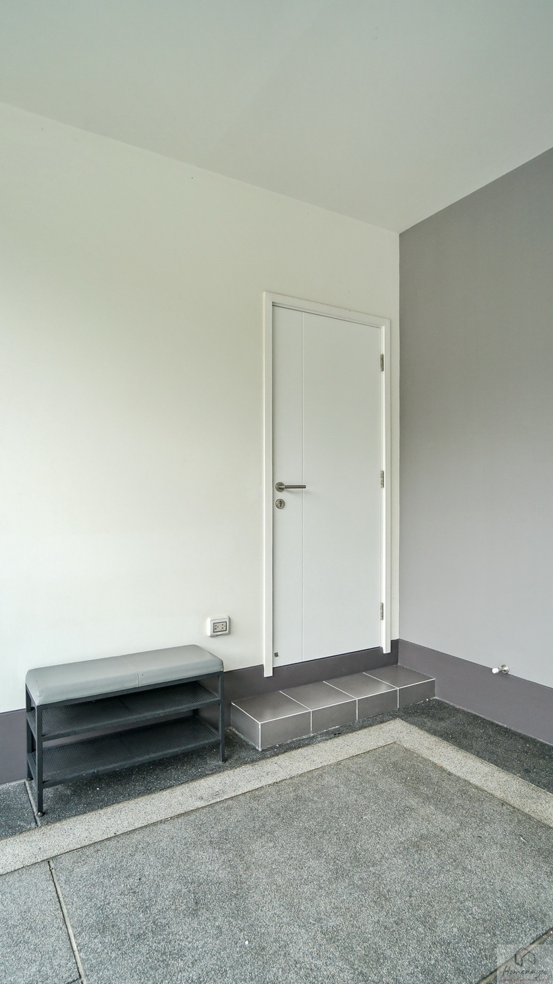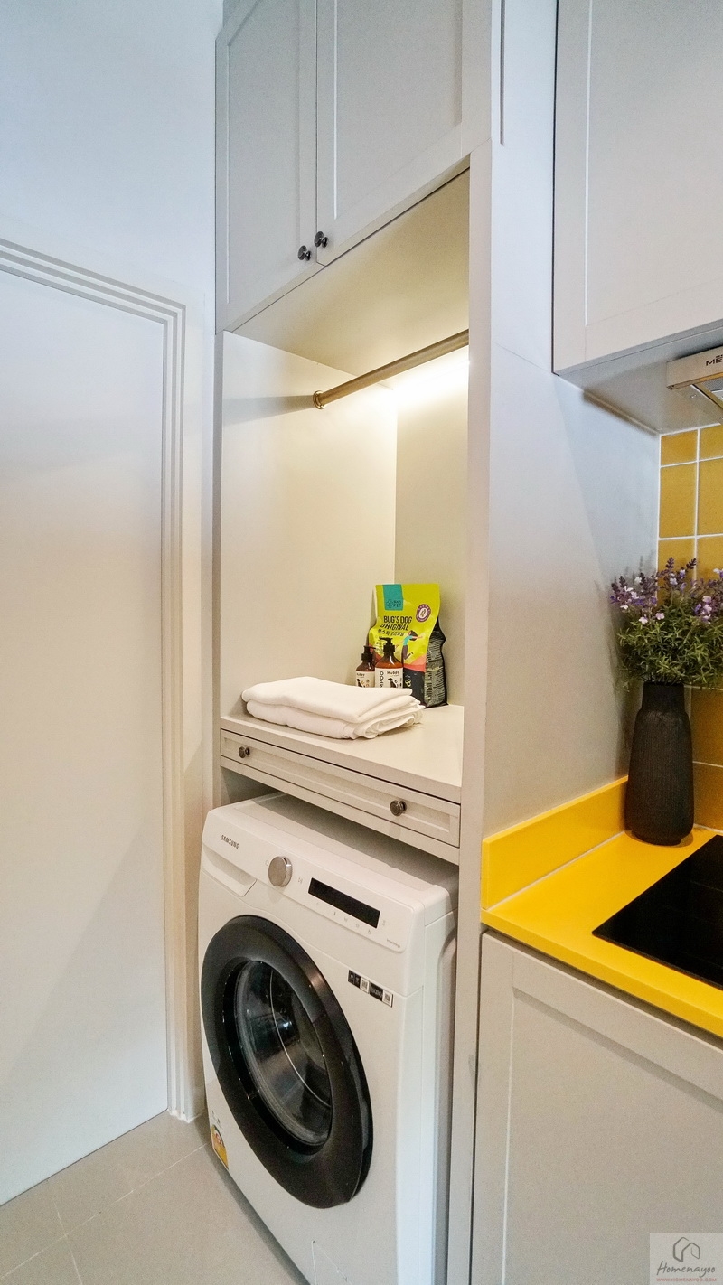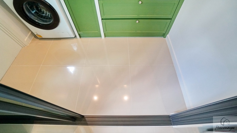 เข้าไปด้านในคือห้องซักรีดแยกโซนด้วยประตูกระจกบานเลื่อน ภายในพื้นที่กว้างกำลังดีทางโครงการเดินงานระบบน้ำ-ระบบไฟมาให้พร้อมใช้งาน
