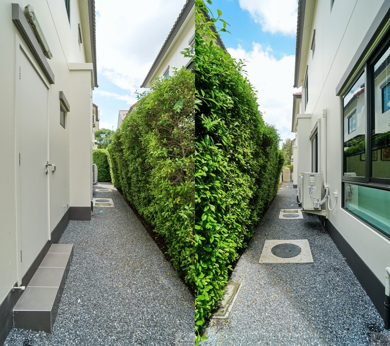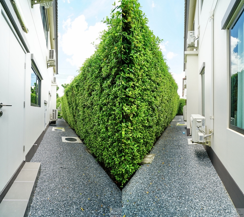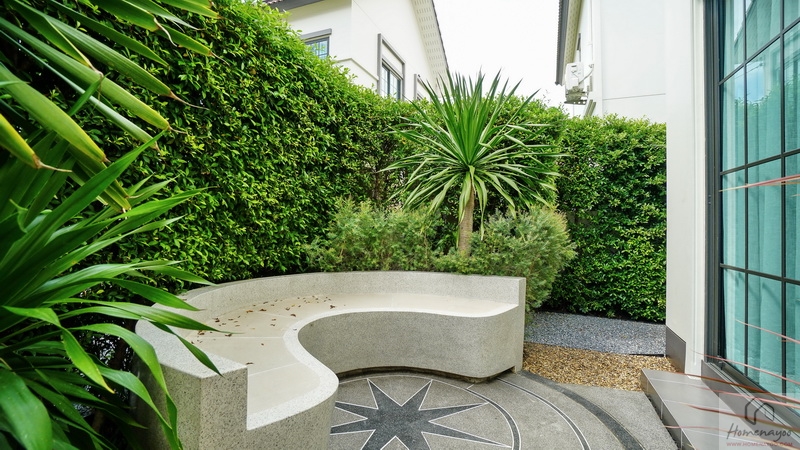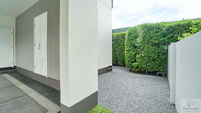 ส่วนซักล้างหลังบ้านมาตรฐานทางโครงการเทพื้นคอนกรีต ติดตั้งแทงค์น้ำและปั๊มน้ำให้พร้อมใช้งาน ส่วนบ้านตัวอย่างเทพื้นหินกรวดตกแต่งสวนแนวตั้งริมรั้ว