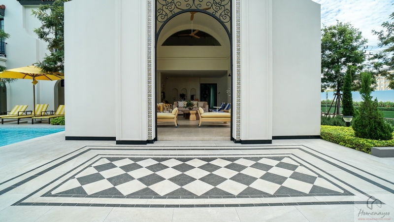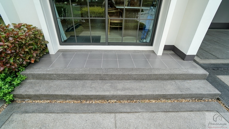 เฉลียงบ้านกว้างยกพื้นขึ้นมา 2 Step ปูพื้นกระเบื้องเซรามิกสีเทาสลับกับพื้นทรายล้าง