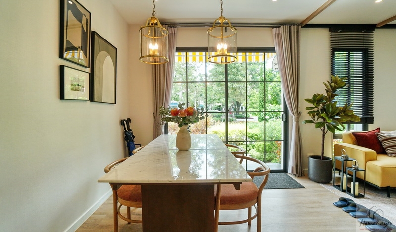 ทั้งจากชุดหน้าต่างบานผสม 2 ชุด กับประตูกระจกบานเลื่อนฝั่งหน้าบ้านและประตูเปิดเชื่อมออกไปยังสวนข้างตัวบ้าน สามารถชมวิวสวนภายนอกได้แบบ 180 องศาเลยค่ะ