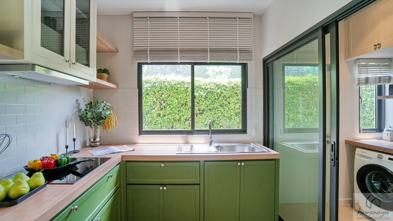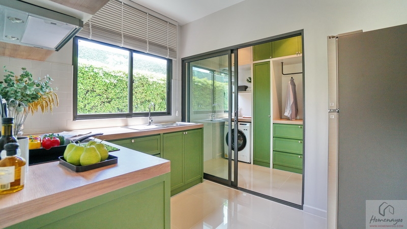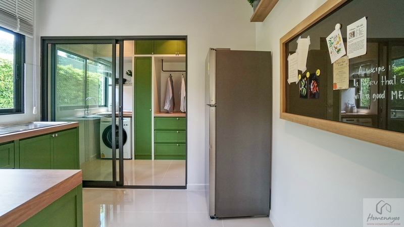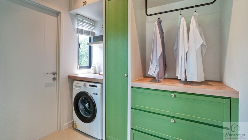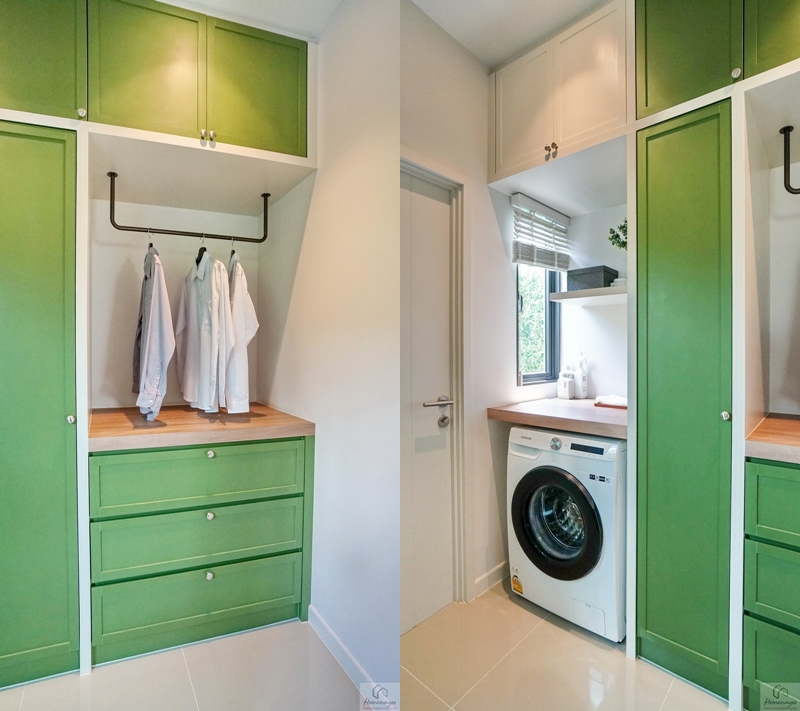 บ้านตัวอย่าง Built-in เคาน์เตอร์ตู้เก็บของทรงสูงโทนสีขาว-เขียวพาสเทลสวยงาม แบ่งพื้นที่สำหรับวางเครื่องซักผ้า, ตู้เก็บของ, ราวแขวนผ้า และมีประตูเปิดเชื่อมออกไปยังส่วนซักล้างหลังบ้านได้ ข้างประตูมีหน้าต่างช่องแสงให้อีก 1 บาน