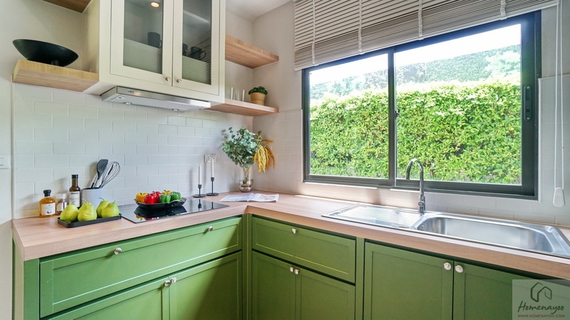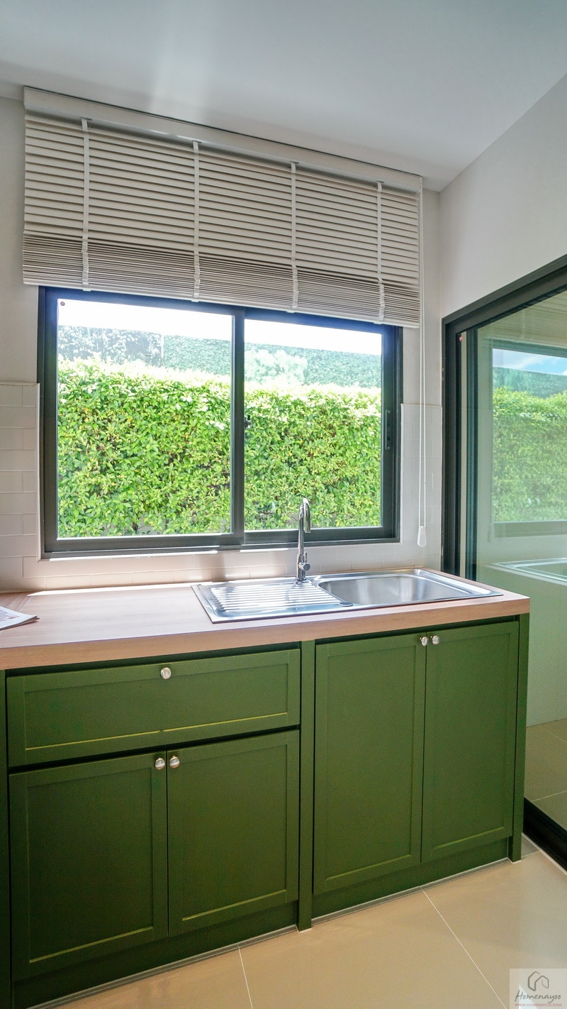 ฝั่งซิงค์ล้างจานตำแหน่งอยู่ใกล้กับหน้าต่างกระจกบานเลื่อน ทำให้เปิดรับแสงหรือระบายอากาศได้ดี