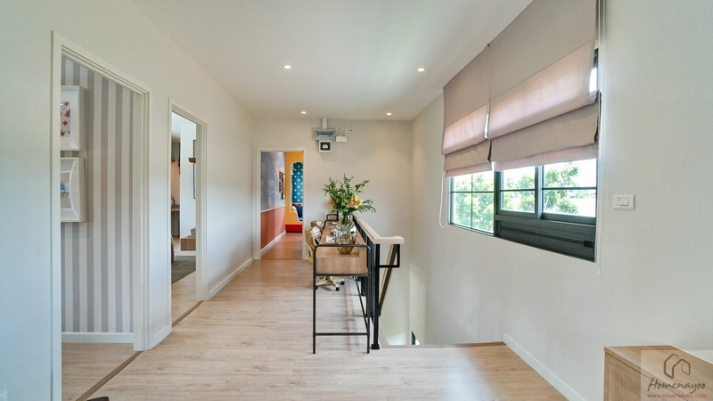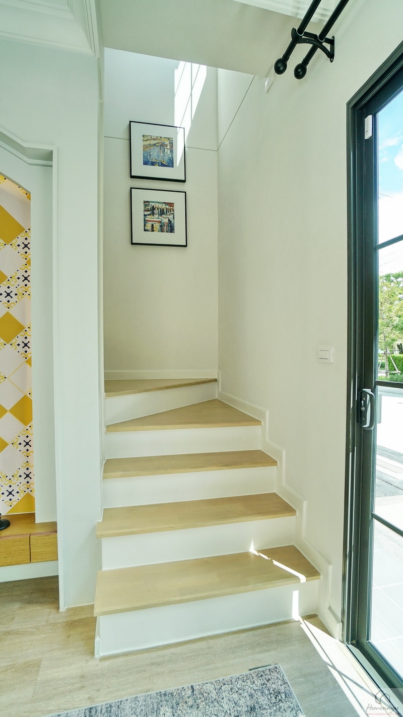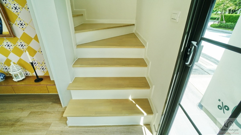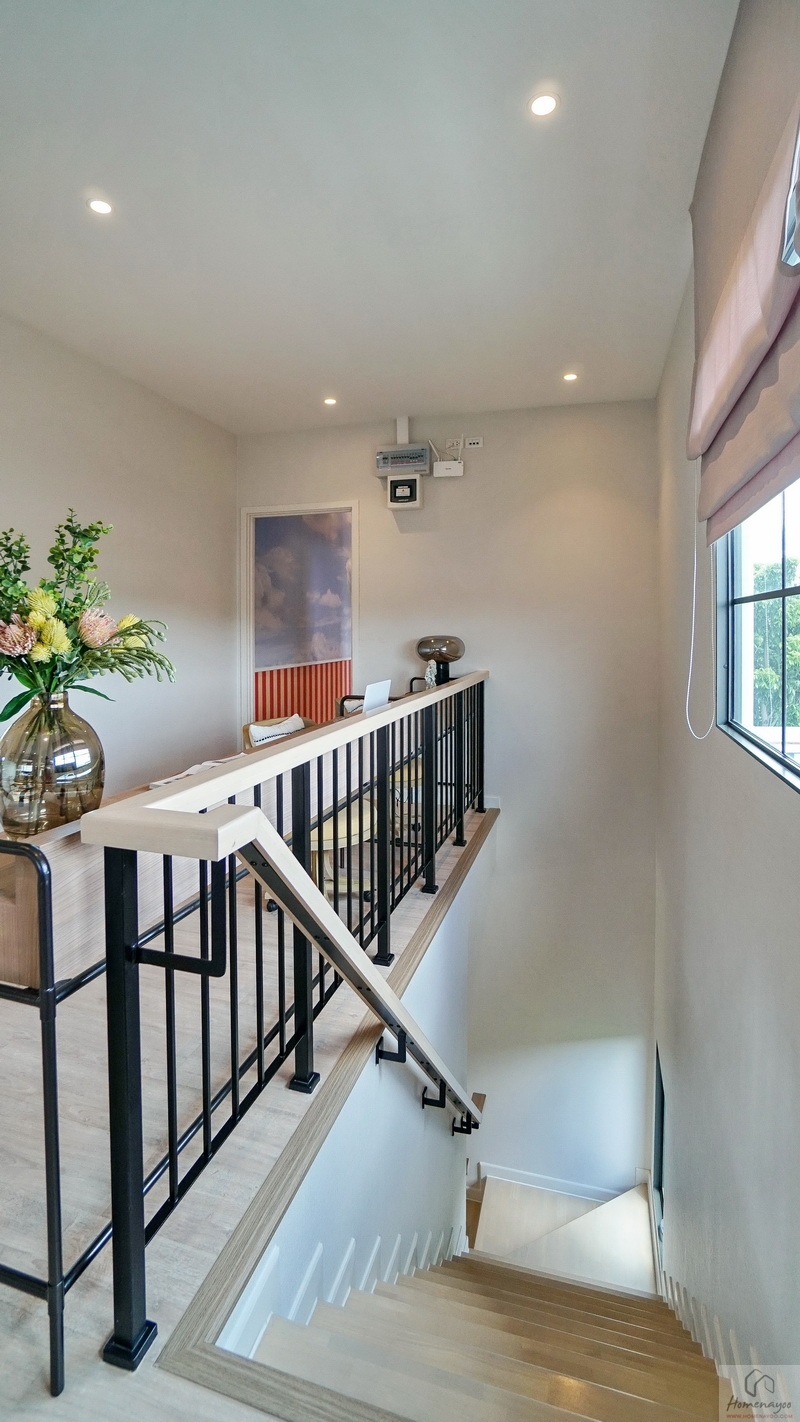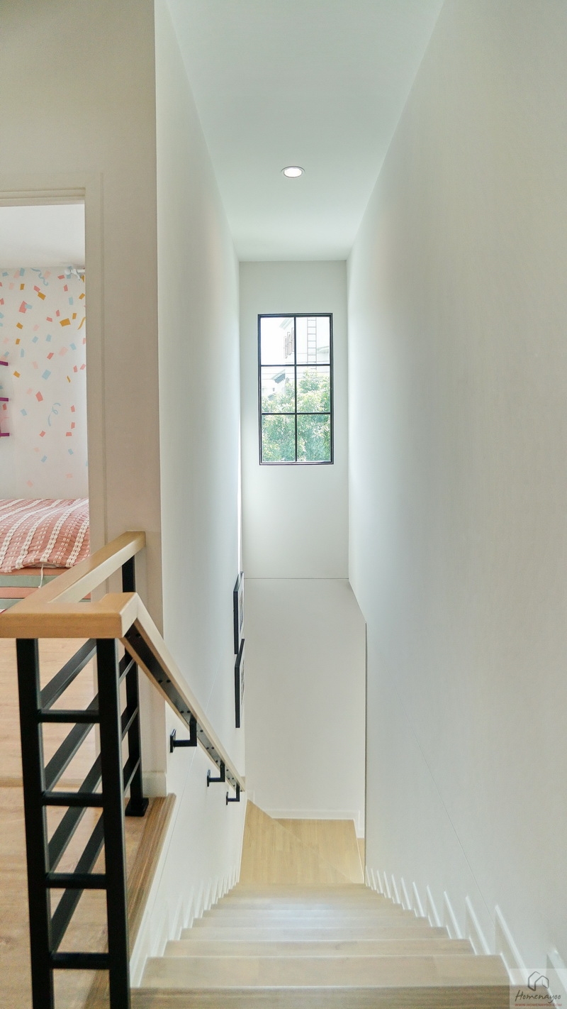 ขึ้นไปดูชั้น 2 ของบ้านกันต่อ โถงบันไดจะอยู่กลางบ้านติดกับห้องน้ำชั้นล่างและพื้นที่อเนกประสงค์ มีราวจับบันไดแบบฝังผนังมือจับใช้ไม้ชนิดเดียวกับลูกนอนยาวต่อเนื่องไปจนถึงชั้นบน ช่วงแรกมีช่องแสงบานกระทุ้งช่วยรับแสงธรรมชาติให้ 1 ชุด