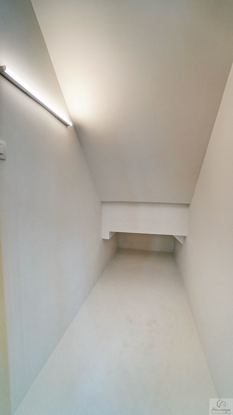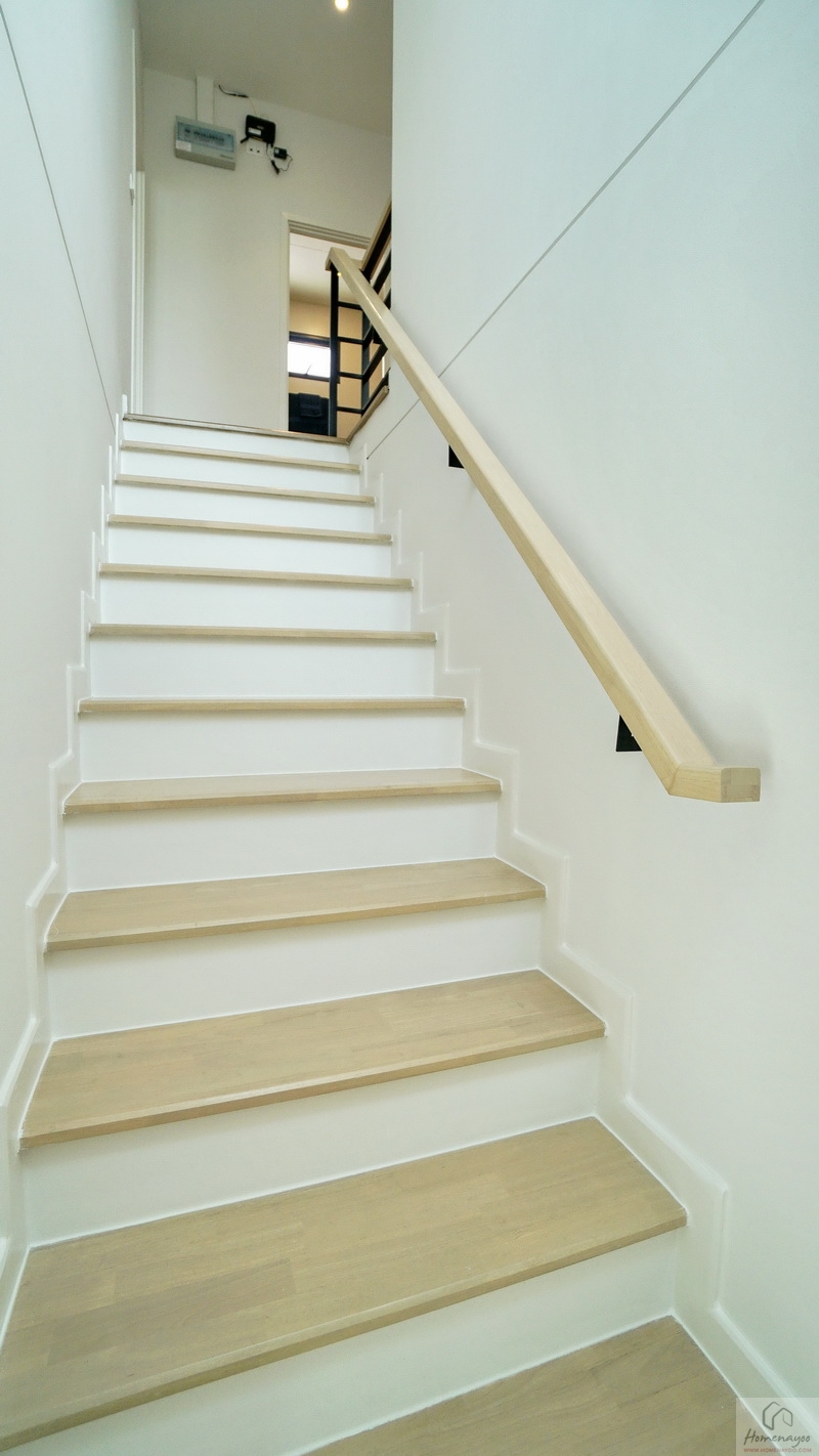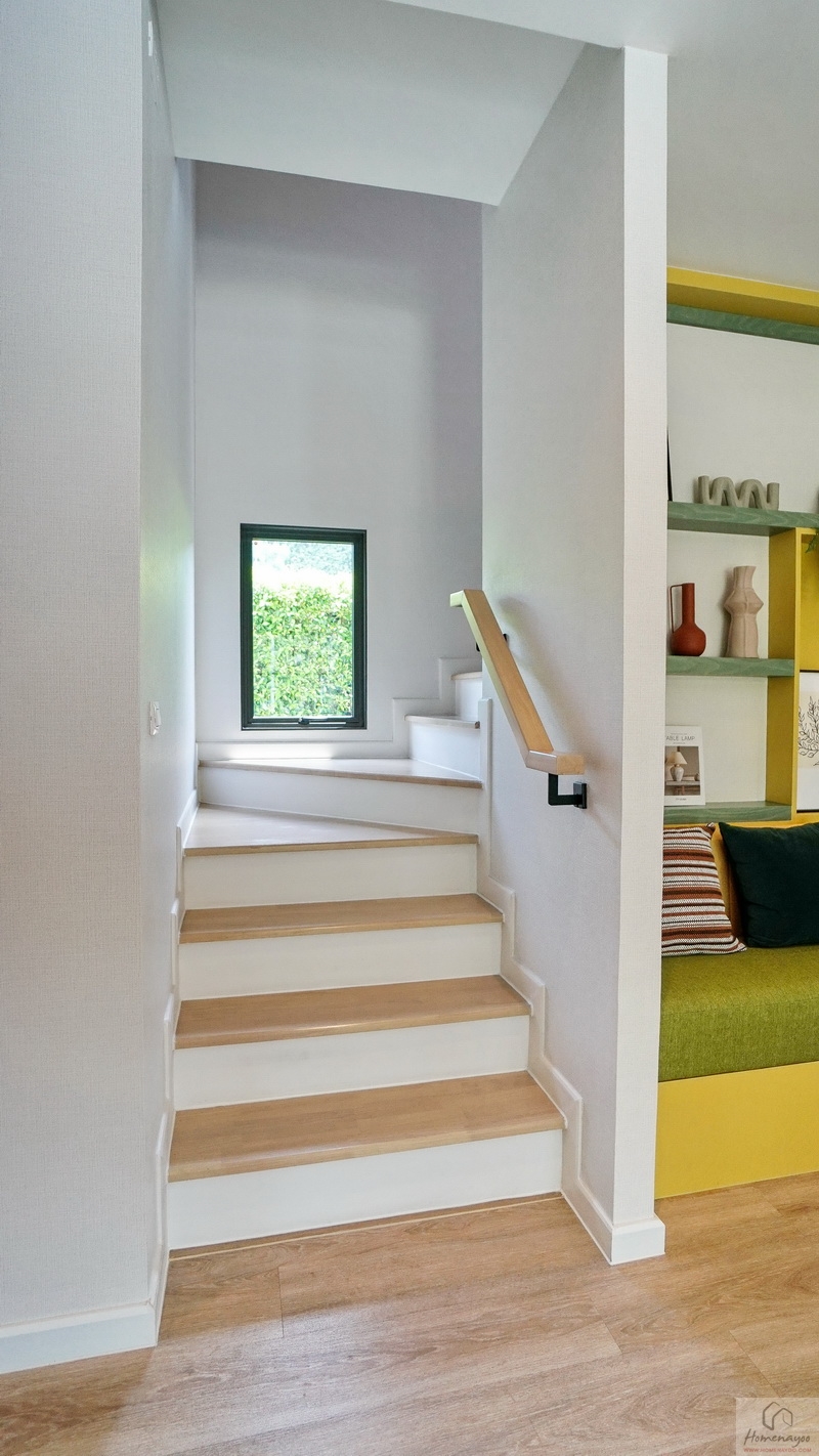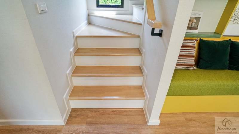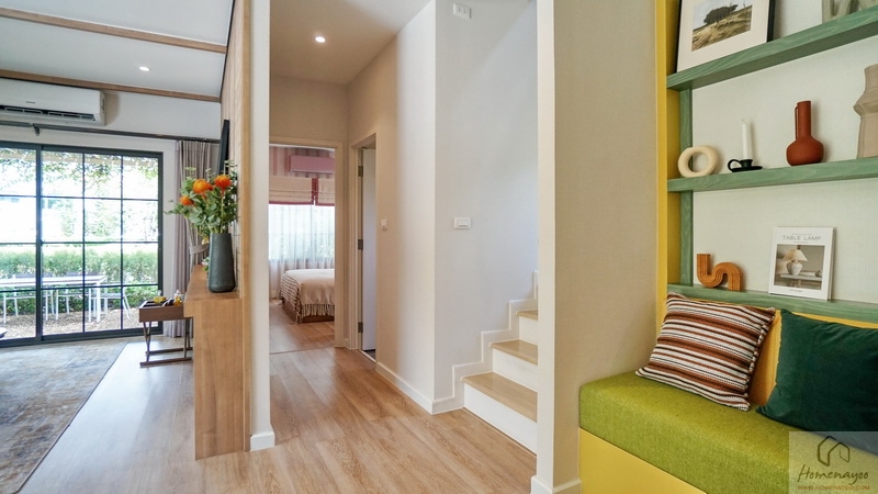 ขึ้นไปดูชั้น 2 ของบ้านกันต่อ โถงบันไดจะอยู่กลางบ้านติดกับห้องน้ำชั้นล่างและพื้นที่อเนกประสงค์ มีราวจับบันไดแบบฝังผนังมือจับใช้ไม้ชนิดเดียวกับลูกนอนยาวต่อเนื่องไปจนถึงชั้นบน ช่วงแรกมีช่องแสงบานกระทุ้งช่วยรับแสงธรรมชาติให้ 1 ชุด