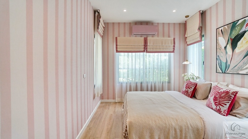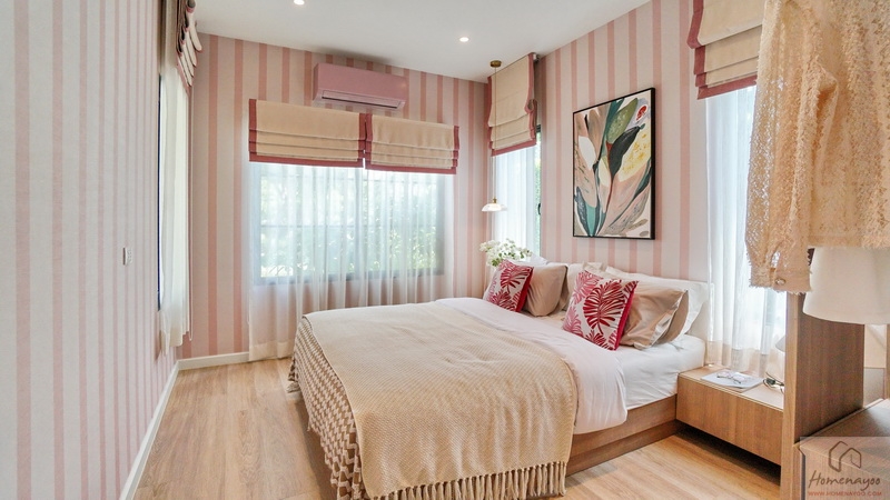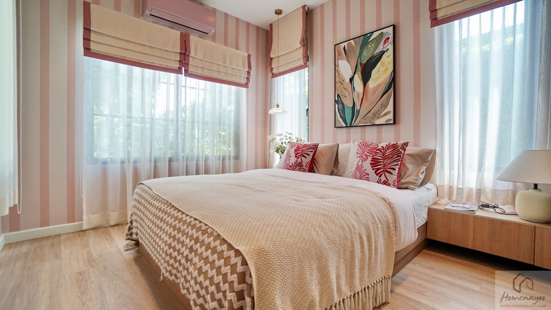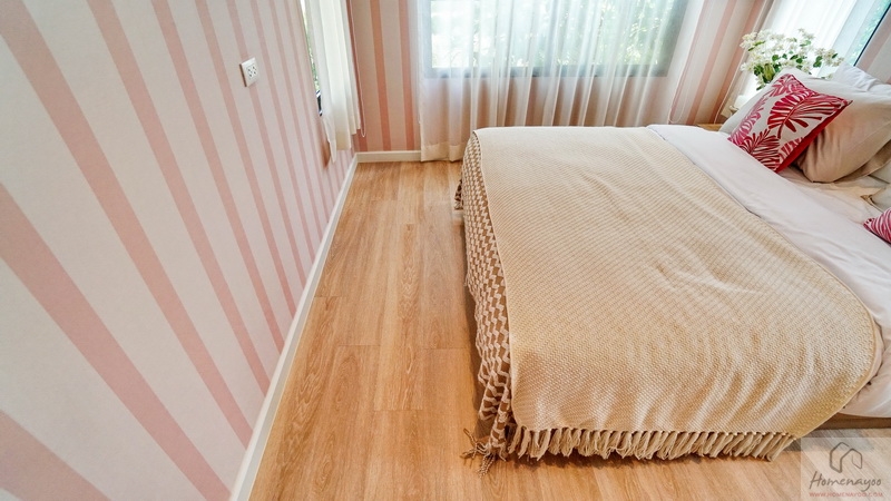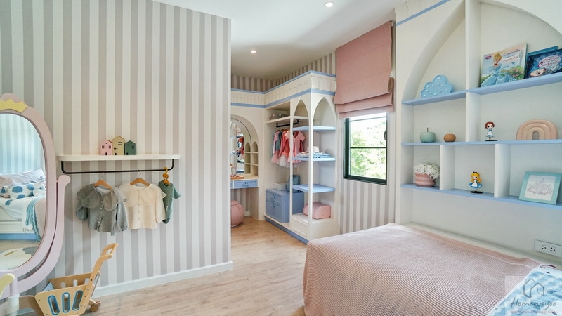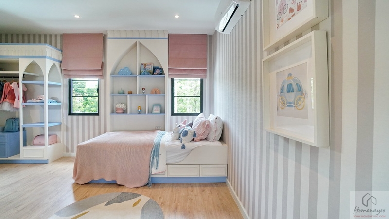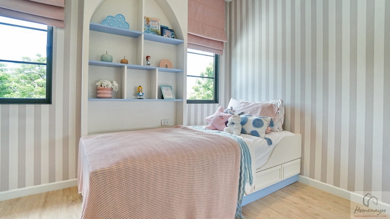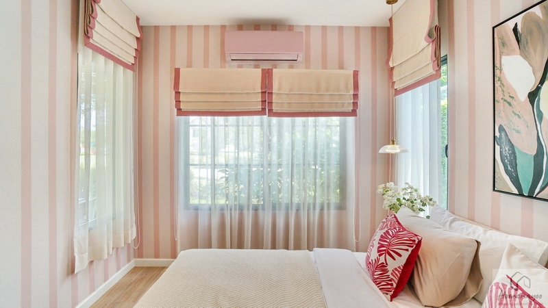ไปดูห้องนอนชั้นล่างกันบ้าง ห้องนี้สามารถปรับฟังก์ชันให้เข้ากับไลฟ์สไตล์ของแต่ละบ้านอย่างหลากหลาย ไม่ว่าจะเป็น ห้องนอนผู้สูงอายุ, ห้องทำงาน, ห้องพักผ่อนดูหนัง หรือห้องงานอดิเรก เป็นต้น ส่วนบ้านตัวอย่างจัดเป็นห้องนอนโทนสีชมพู-ขาวหวาน ๆ