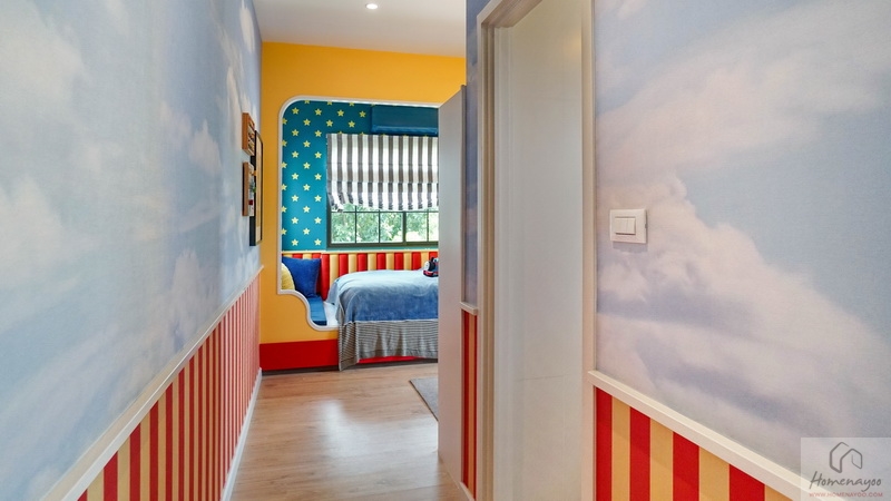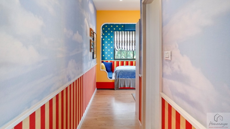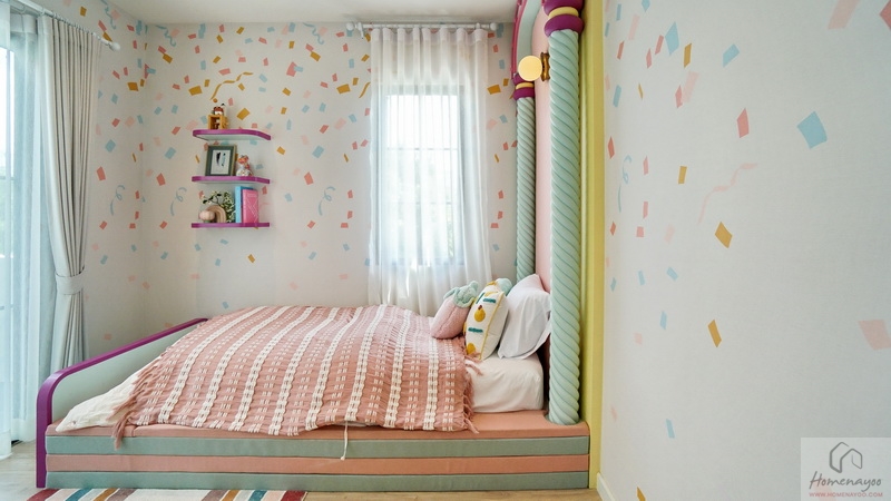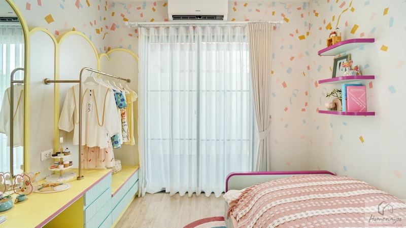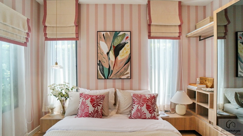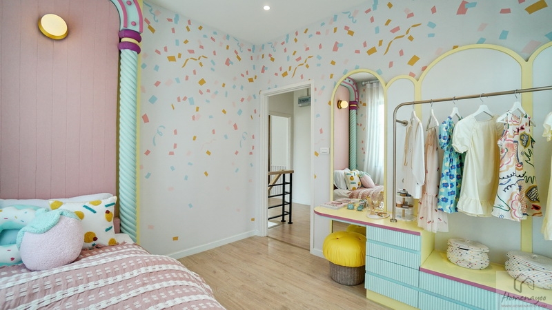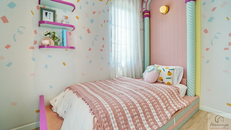 เข้ามาภายในห้องบ้านตัวอย่างตกแต่งด้วย Wallpaper สีสันสดใสน่ารัก ๆ ส่วนแรกจะเจอห้องน้ำในตัวก่อนเลย ถัดเข้าไปคือโซนพักผ่อนสำหรับวางเตียงนอนและเฟอร์นิเจอร์มาตรฐานต่าง ๆ